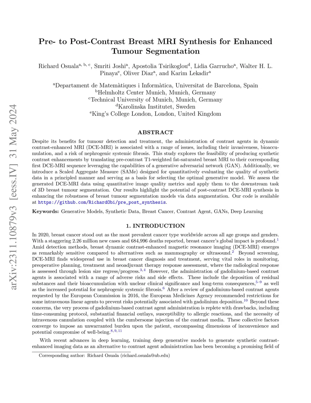Pre- to Post-Contrast Breast MRI Synthesis for Enhanced Tumour