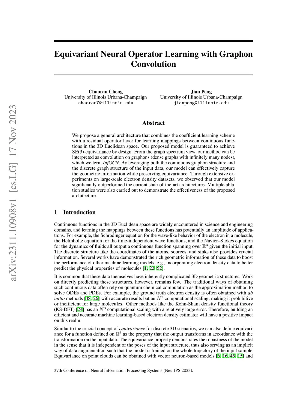 We propose a general architecture that combines the coefficient learning scheme with a residual operator layer for learning mappings between continuous functions in the 3D Euclidean space. Our proposed model is guaranteed to achieve SE(3)-equivariance by design. From the graph spectrum view, our method can be interpreted as convolution on graphons (dense graphs with infinitely many nodes), which we term InfGCN. By leveraging both the continuous graphon structure and the discrete graph structure of the input data, our model can effectively capture the geometric information while preserving equivariance. Through extensive experiments on large-scale electron density datasets, we observed that our model significantly outperformed the current state-of-the-art architectures. Multiple ablation studies were also carried out to demonstrate the effectiveness of the proposed architecture.
