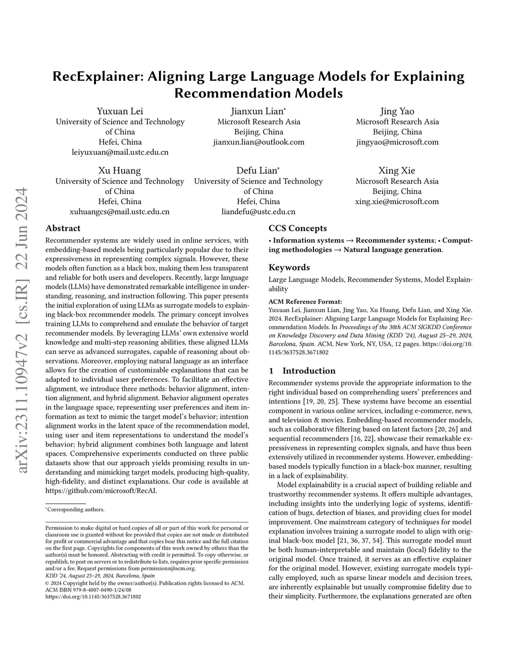 Recommender systems are widely used in online services, with embedding-based models being particularly popular due to their expressiveness in representing complex signals. However, these models often function as a black box, making them less transparent and reliable for both users and developers. Recently, large language models (LLMs) have demonstrated remarkable intelligence in understanding, reasoning, and instruction following. This paper presents the initial exploration of using LLMs as surrogate models to explaining black-box recommender models. The primary concept involves training LLMs to comprehend and emulate the behavior of target recommender models. By leveraging LLMs' own extensive world knowledge and multi-step reasoning abilities, these aligned LLMs can serve as advanced surrogates, capable of reasoning about observations. Moreover, employing natural language as an interface allows for the creation of customizable explanations that can be adapted to individual user preferences. To facilitate an effective alignment, we introduce three methods: behavior alignment, intention alignment, and hybrid alignment. Behavior alignment operates in the language space, representing user preferences and item information as text to mimic the target model's behavior; intention alignment works in the latent space of the recommendation model, using user and item representations to understand the model's behavior; hybrid alignment combines both language and latent spaces. Comprehensive experiments conducted on three public datasets show that our approach yields promising results in understanding and mimicking target models, producing high-quality, high-fidelity, and distinct explanations. Our code is available at https://github.com/microsoft/RecAI.