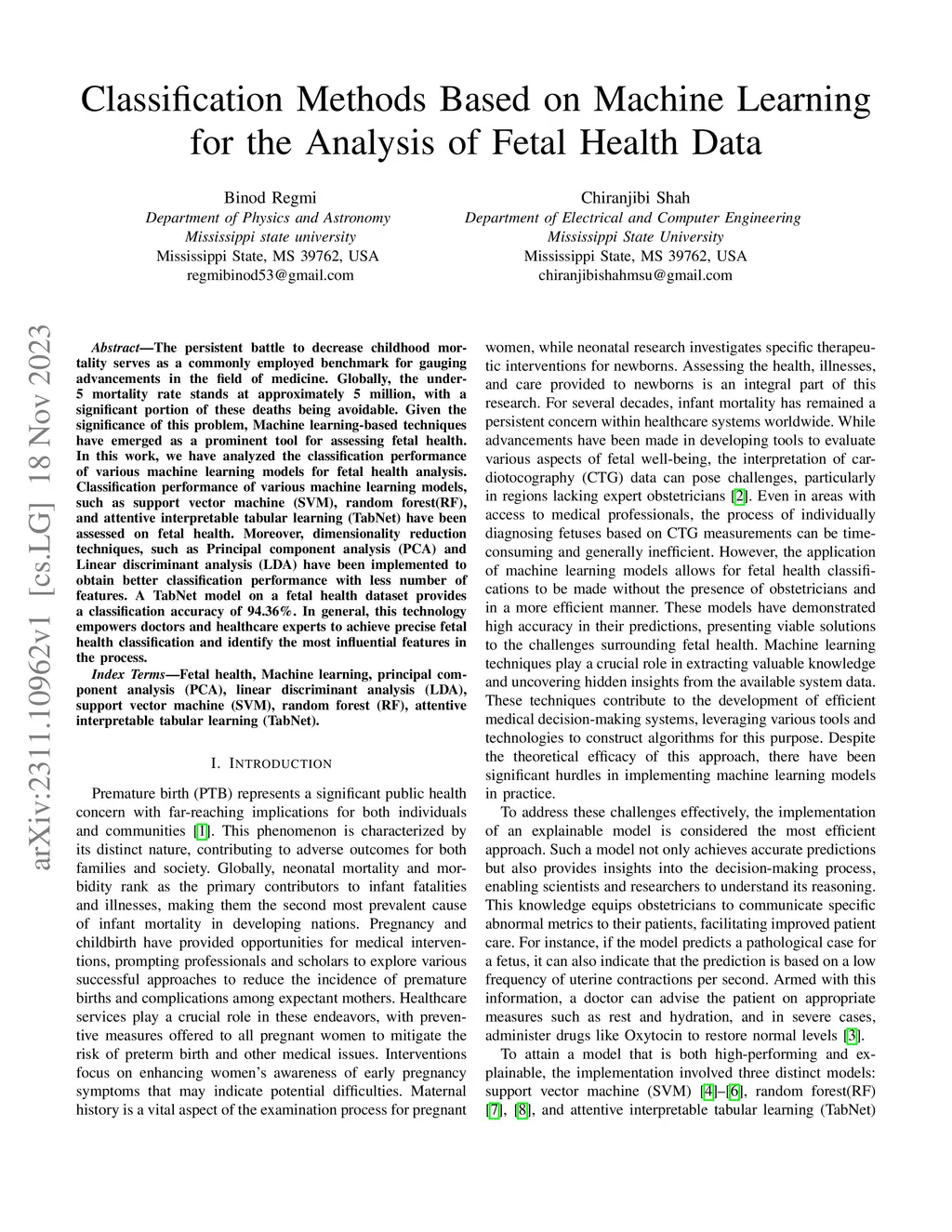 The persistent battle to decrease childhood mortality serves as a commonly employed benchmark for gauging advancements in the field of medicine. Globally, the under-5 mortality rate stands at approximately 5 million, with a significant portion of these deaths being avoidable. Given the significance of this problem, Machine learning-based techniques have emerged as a prominent tool for assessing fetal health. In this work, we have analyzed the classification performance of various machine learning models for fetal health analysis. Classification performance of various machine learning models, such as support vector machine (SVM), random forest(RF), and attentive interpretable tabular learning (TabNet) have been assessed on fetal health. Moreover, dimensionality reduction techniques, such as Principal component analysis (PCA) and Linear discriminant analysis (LDA) have been implemented to obtain better classification performance with less number of features. A TabNet model on a fetal health dataset provides a classification accuracy of 94.36%. In general, this technology empowers doctors and healthcare experts to achieve precise fetal health classification and identify the most influential features in the process.