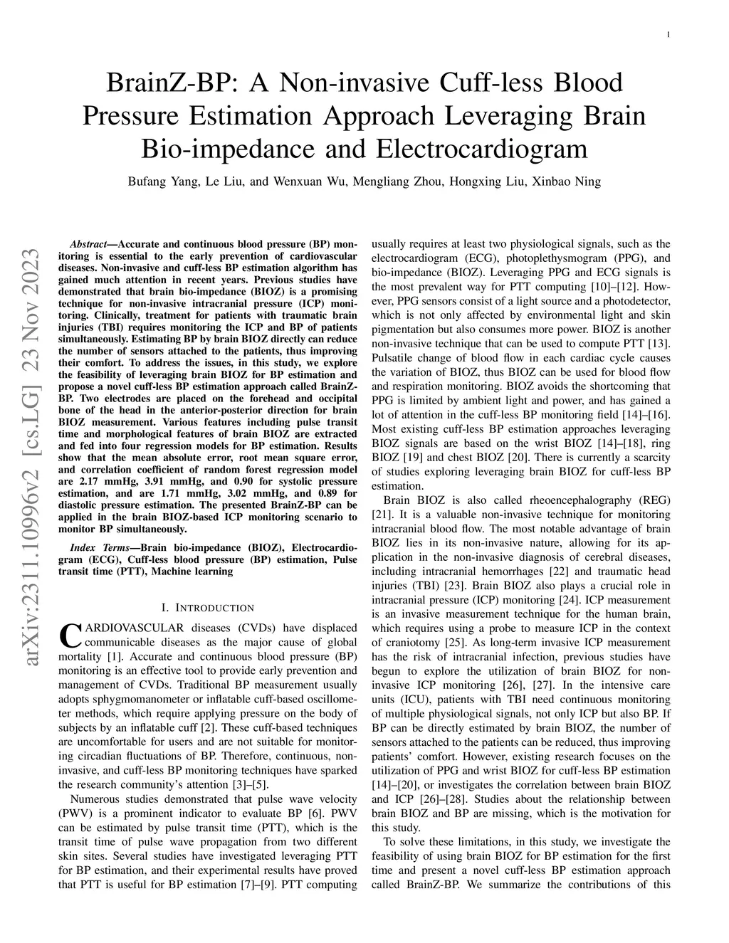 BrainZ-BP: A Non-invasive Cuff-less Blood Pressure Estimation Approach
