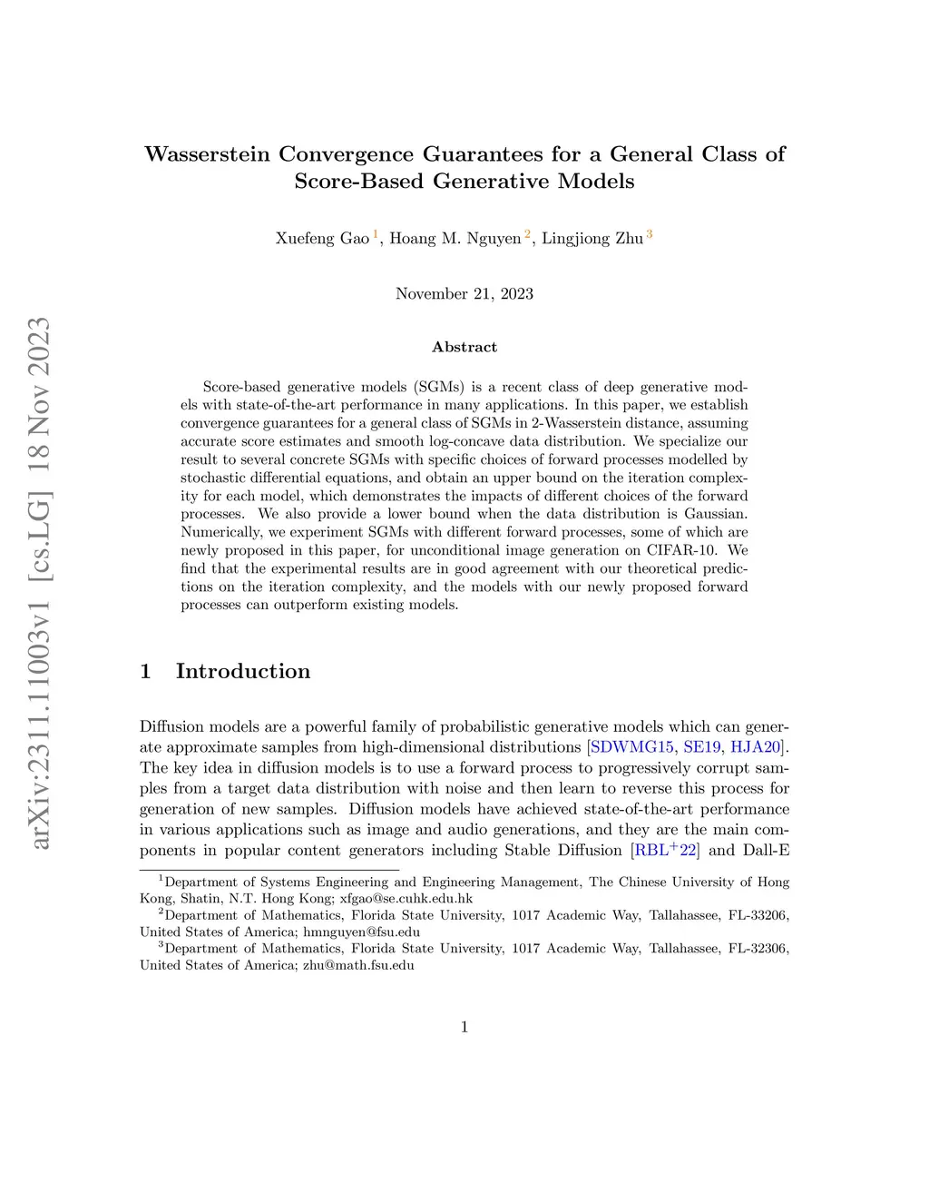 Score-based generative models (SGMs) is a recent class of deep generative models with state-of-the-art performance in many applications. In this paper, we establish convergence guarantees for a general class of SGMs in 2-Wasserstein distance, assuming accurate score estimates and smooth log-concave data distribution. We specialize our result to several concrete SGMs with specific choices of forward processes modelled by stochastic differential equations, and obtain an upper bound on the iteration complexity for each model, which demonstrates the impacts of different choices of the forward processes. We also provide a lower bound when the data distribution is Gaussian. Numerically, we experiment SGMs with different forward processes, some of which are newly proposed in this paper, for unconditional image generation on CIFAR-10. We find that the experimental results are in good agreement with our theoretical predictions on the iteration complexity, and the models with our newly proposed forward processes can outperform existing models.