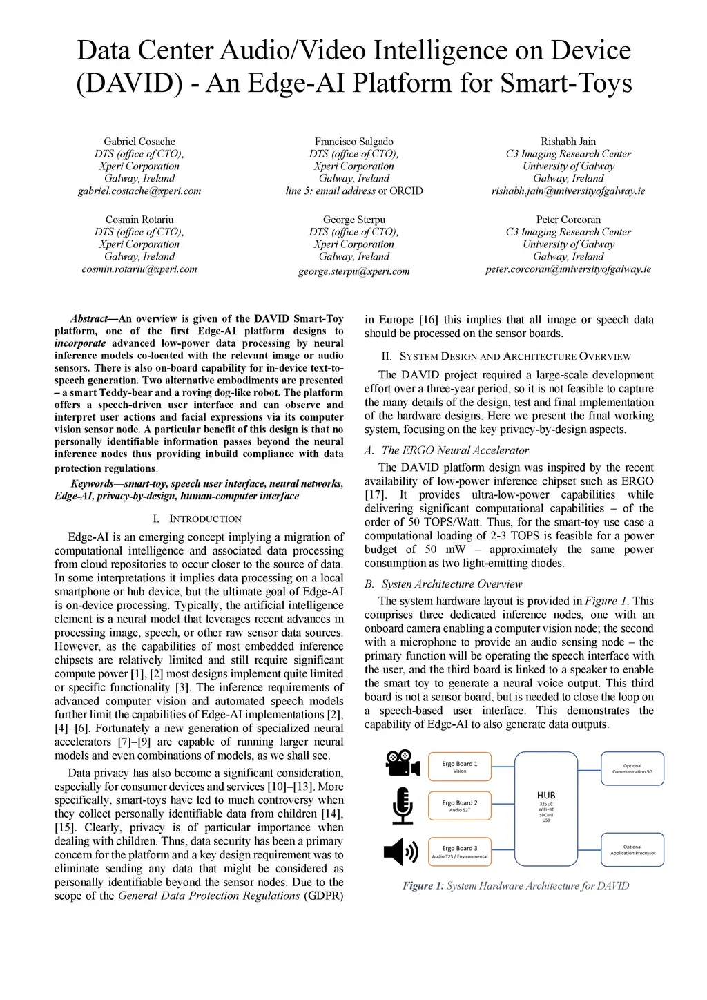 An overview is given of the DAVID Smart-Toy platform, one of the first Edge AI platform designs to incorporate advanced low-power data processing by neural inference models co-located with the relevant image or audio sensors. There is also on-board capability for in-device text-to-speech generation. Two alternative embodiments are presented: a smart Teddy-bear, and a roving dog-like robot. The platform offers a speech-driven user interface and can observe and interpret user actions and facial expressions via its computer vision sensor node. A particular benefit of this design is that no personally identifiable information passes beyond the neural inference nodes thus providing inbuilt compliance with data protection regulations.