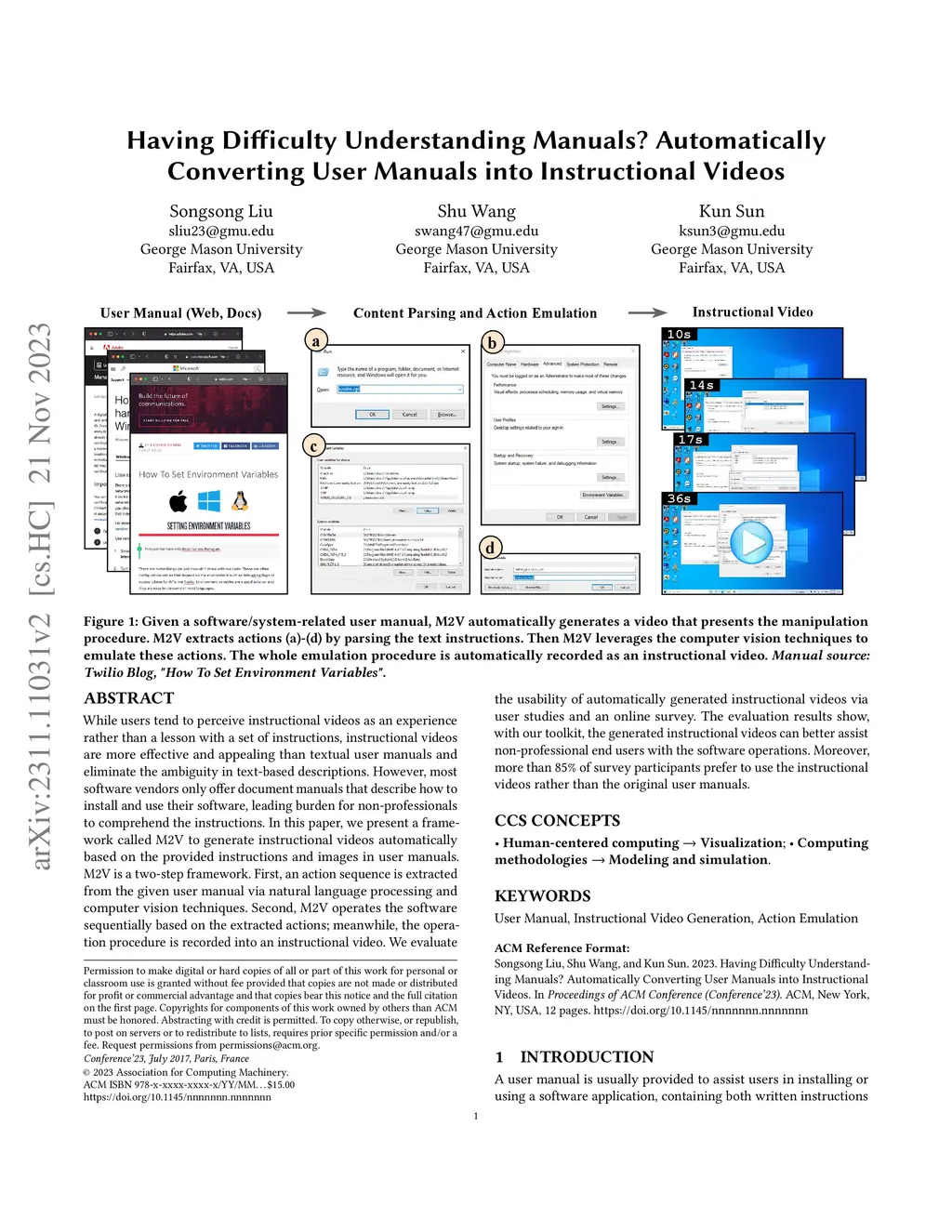 While users tend to perceive instructional videos as an experience rather than a lesson with a set of instructions, instructional videos are more effective and appealing than textual user manuals and eliminate the ambiguity in text-based descriptions. However, most software vendors only offer document manuals that describe how to install and use their software, leading burden for non-professionals to comprehend the instructions. In this paper, we present a framework called M2V to generate instructional videos automatically based on the provided instructions and images in user manuals. M2V is a two-step framework. First, an action sequence is extracted from the given user manual via natural language processing and computer vision techniques. Second, M2V operates the software sequentially based on the extracted actions; meanwhile, the operation procedure is recorded into an instructional video. We evaluate the usability of automatically generated instructional videos via user studies and an online survey. The evaluation results show, with our toolkit, the generated instructional videos can better assist non-professional end users with the software operations. Moreover, more than 85% of survey participants prefer to use the instructional videos rather than the original user manuals.
