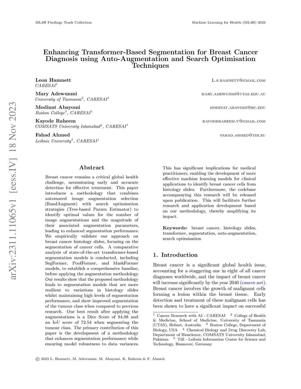 Breast cancer remains a critical global health challenge, necessitating early and accurate detection for effective treatment. This paper introduces a methodology that combines automated image augmentation selection (RandAugment) with search optimisation strategies (Tree-based Parzen Estimator) to identify optimal values for the number of image augmentations and the magnitude of their associated augmentation parameters, leading to enhanced segmentation performance. We empirically validate our approach on breast cancer histology slides, focusing on the segmentation of cancer cells. A comparative analysis of state-of-the-art transformer-based segmentation models is conducted, including SegFormer, PoolFormer, and MaskFormer models, to establish a comprehensive baseline, before applying the augmentation methodology. Our results show that the proposed methodology leads to segmentation models that are more resilient to variations in histology slides whilst maintaining high levels of segmentation performance, and show improved segmentation of the tumour class when compared to previous research. Our best result after applying the augmentations is a Dice Score of 84.08 and an IoU score of 72.54 when segmenting the tumour class. The primary contribution of this paper is the development of a methodology that enhances segmentation performance while ensuring model robustness to data variances. This has significant implications for medical practitioners, enabling the development of more effective machine learning models for clinical applications to identify breast cancer cells from histology slides. Furthermore, the codebase accompanying this research will be released upon publication. This will facilitate further research and application development based on our methodology, thereby amplifying its impact.