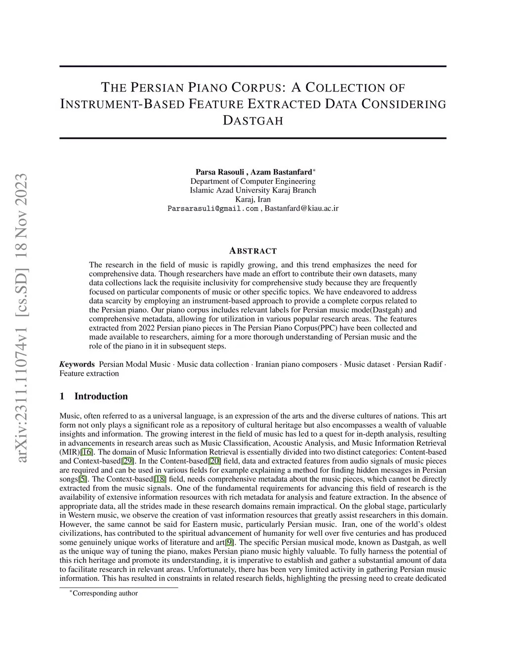 The Persian Piano Corpus: A Collection Of Instrument-Based Feature