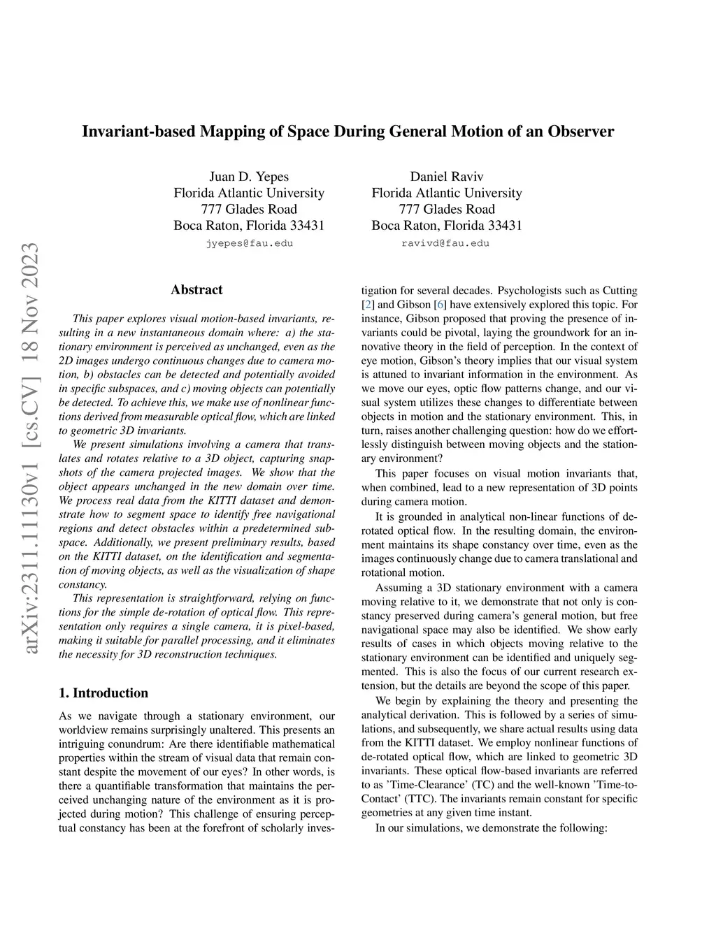 This paper explores visual motion-based invariants, resulting in a new instantaneous domain where: a) the stationary environment is perceived as unchanged, even as the 2D images undergo continuous changes due to camera motion, b) obstacles can be detected and potentially avoided in specific subspaces, and c) moving objects can potentially be detected. To achieve this, we make use of nonlinear functions derived from measurable optical flow, which are linked to geometric 3D invariants. We present simulations involving a camera that translates and rotates relative to a 3D object, capturing snapshots of the camera projected images. We show that the object appears unchanged in the new domain over time. We process real data from the KITTI dataset and demonstrate how to segment space to identify free navigational regions and detect obstacles within a predetermined subspace. Additionally, we present preliminary results, based on the KITTI dataset, on the identification and segmentation of moving objects, as well as the visualization of shape constancy. This representation is straightforward, relying on functions for the simple de-rotation of optical flow. This representation only requires a single camera, it is pixel-based, making it suitable for parallel processing, and it eliminates the necessity for 3D reconstruction techniques.