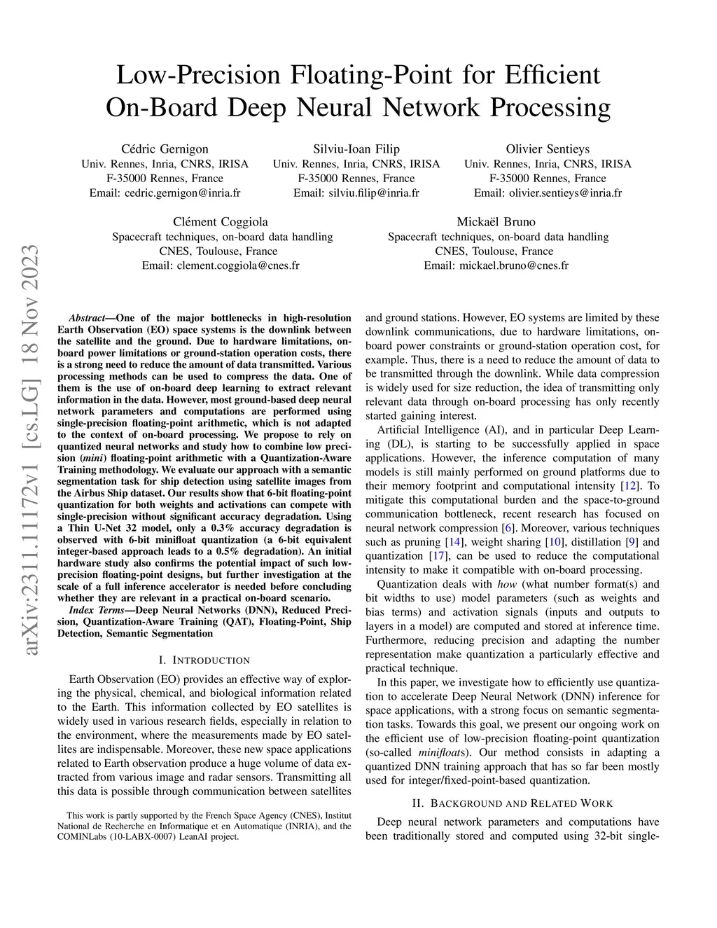 One of the major bottlenecks in high-resolution Earth Observation (EO) space systems is the downlink between the satellite and the ground. Due to hardware limitations, on-board power limitations or ground-station operation costs, there is a strong need to reduce the amount of data transmitted. Various processing methods can be used to compress the data. One of them is the use of on-board deep learning to extract relevant information in the data. However, most ground-based deep neural network parameters and computations are performed using single-precision floating-point arithmetic, which is not adapted to the context of on-board processing. We propose to rely on quantized neural networks and study how to combine low precision (mini) floating-point arithmetic with a Quantization-Aware Training methodology. We evaluate our approach with a semantic segmentation task for ship detection using satellite images from the Airbus Ship dataset. Our results show that 6-bit floating-point quantization for both weights and activations can compete with single-precision without significant accuracy degradation. Using a Thin U-Net 32 model, only a 0.3% accuracy degradation is observed with 6-bit minifloat quantization (a 6-bit equivalent integer-based approach leads to a 0.5% degradation). An initial hardware study also confirms the potential impact of such low-precision floating-point designs, but further investigation at the scale of a full inference accelerator is needed before concluding whether they are relevant in a practical on-board scenario.