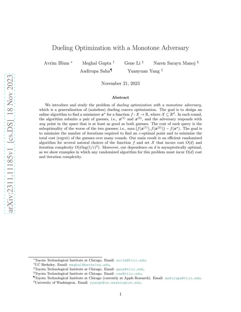 We introduce and study the problem of dueling optimization with a monotone adversary, which is a generalization of (noiseless) dueling convex optimization. The goal is to design an online algorithm to find a minimizer for a function , where . In each round, the algorithm submits a pair of guesses, i.e., and , and the adversary responds with any point in the space that is at least as good as both guesses. The cost of each query is the suboptimality of the worse of the two guesses; i.e., . The goal is to minimize the number of iterations required to find an -optimal point and to minimize the total cost (regret) of the guesses over many rounds. Our main result is an efficient randomized algorithm for several natural choices of the function and set that incurs cost and iteration complexity . Moreover, our dependence on is asymptotically optimal, as we show examples in which any randomized algorithm for this problem must incur cost and iteration complexity.