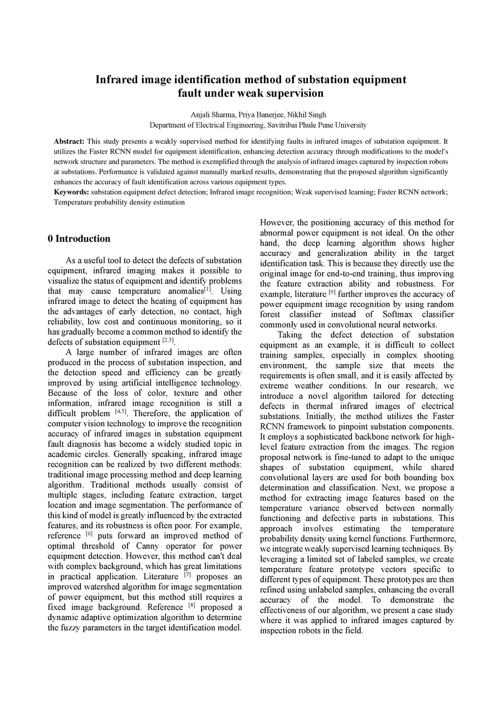 This study presents a weakly supervised method for identifying faults in infrared images of substation equipment. It utilizes the Faster RCNN model for equipment identification, enhancing detection accuracy through modifications to the model's network structure and parameters. The method is exemplified through the analysis of infrared images captured by inspection robots at substations. Performance is validated against manually marked results, demonstrating that the proposed algorithm significantly enhances the accuracy of fault identification across various equipment types.
