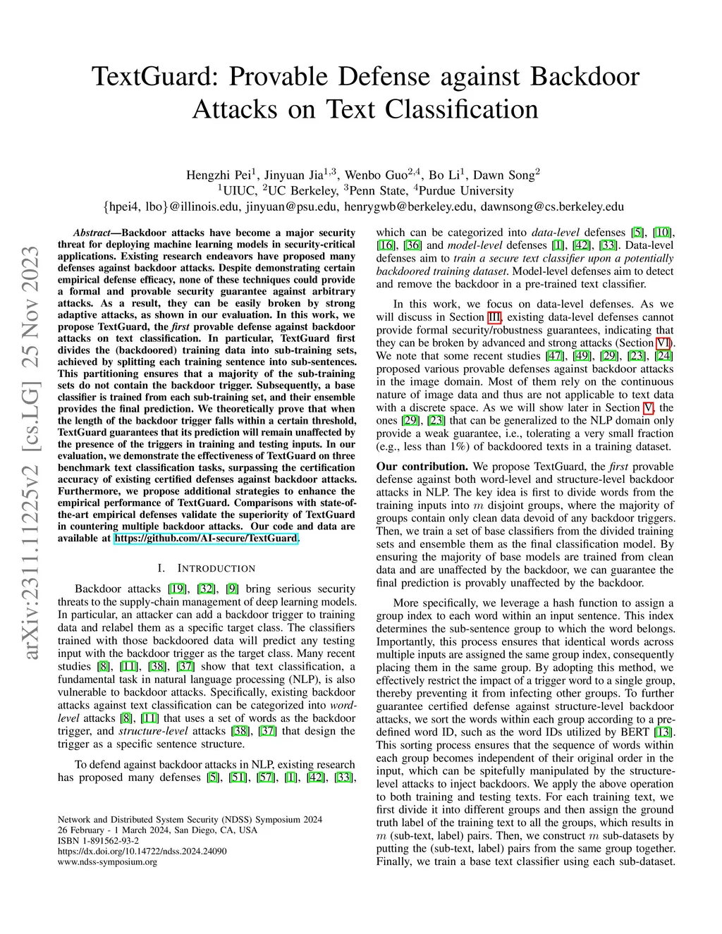 TextGuard: Provable Defense against Backdoor Attacks on Text