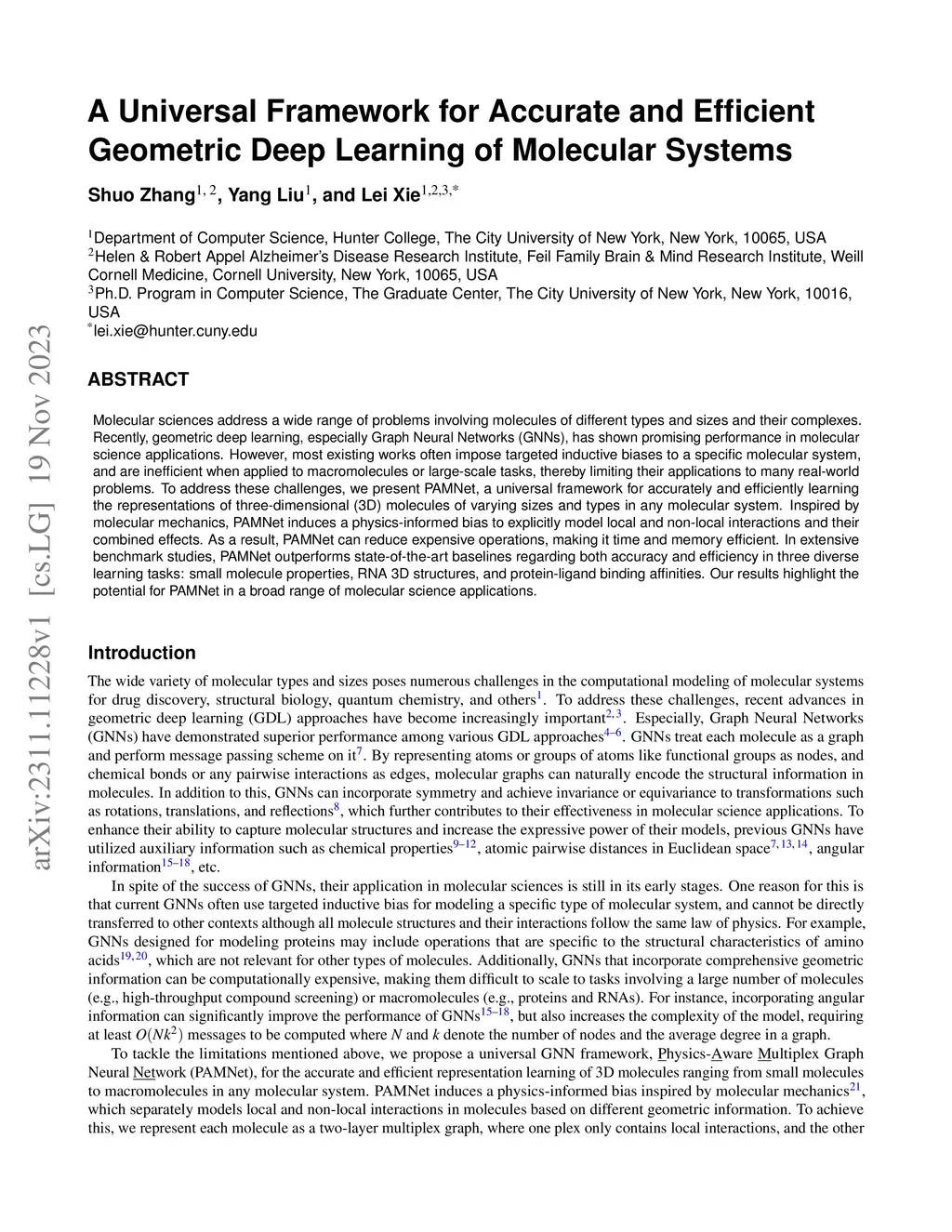 Molecular sciences address a wide range of problems involving molecules of different types and sizes and their complexes. Recently, geometric deep learning, especially Graph Neural Networks, has shown promising performance in molecular science applications. However, most existing works often impose targeted inductive biases to a specific molecular system, and are inefficient when applied to macromolecules or large-scale tasks, thereby limiting their applications to many real-world problems. To address these challenges, we present PAMNet, a universal framework for accurately and efficiently learning the representations of three-dimensional (3D) molecules of varying sizes and types in any molecular system. Inspired by molecular mechanics, PAMNet induces a physics-informed bias to explicitly model local and non-local interactions and their combined effects. As a result, PAMNet can reduce expensive operations, making it time and memory efficient. In extensive benchmark studies, PAMNet outperforms state-of-the-art baselines regarding both accuracy and efficiency in three diverse learning tasks: small molecule properties, RNA 3D structures, and protein-ligand binding affinities. Our results highlight the potential for PAMNet in a broad range of molecular science applications.