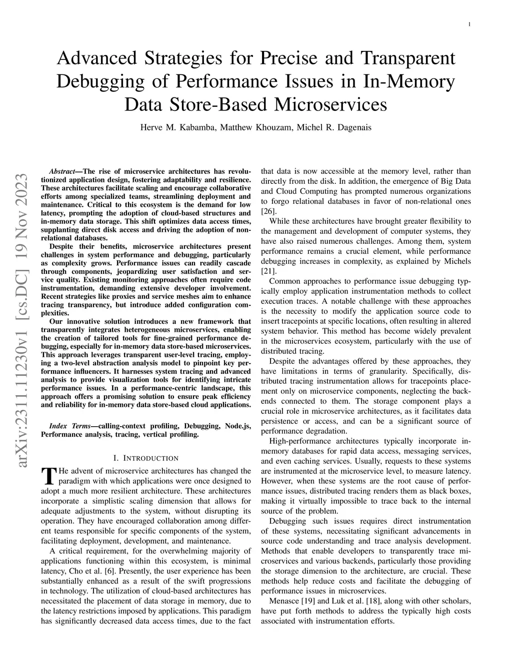 The rise of microservice architectures has revolutionized application design, fostering adaptability and resilience. These architectures facilitate scaling and encourage collaborative efforts among specialized teams, streamlining deployment and maintenance. Critical to this ecosystem is the demand for low latency, prompting the adoption of cloud-based structures and in-memory data storage. This shift optimizes data access times, supplanting direct disk access and driving the adoption of non-relational databases. Despite their benefits, microservice architectures present challenges in system performance and debugging, particularly as complexity grows. Performance issues can readily cascade through components, jeopardizing user satisfaction and service quality. Existing monitoring approaches often require code instrumentation, demanding extensive developer involvement. Recent strategies like proxies and service meshes aim to enhance tracing transparency, but introduce added configuration complexities. Our innovative solution introduces a new framework that transparently integrates heterogeneous microservices, enabling the creation of tailored tools for fine-grained performance debugging, especially for in-memory data store-based microservices. This approach leverages transparent user-level tracing, employing a two-level abstraction analysis model to pinpoint key performance influencers. It harnesses system tracing and advanced analysis to provide visualization tools for identifying intricate performance issues. In a performance-centric landscape, this approach offers a promising solution to ensure peak efficiency and reliability for in-memory data store-based cloud applications.