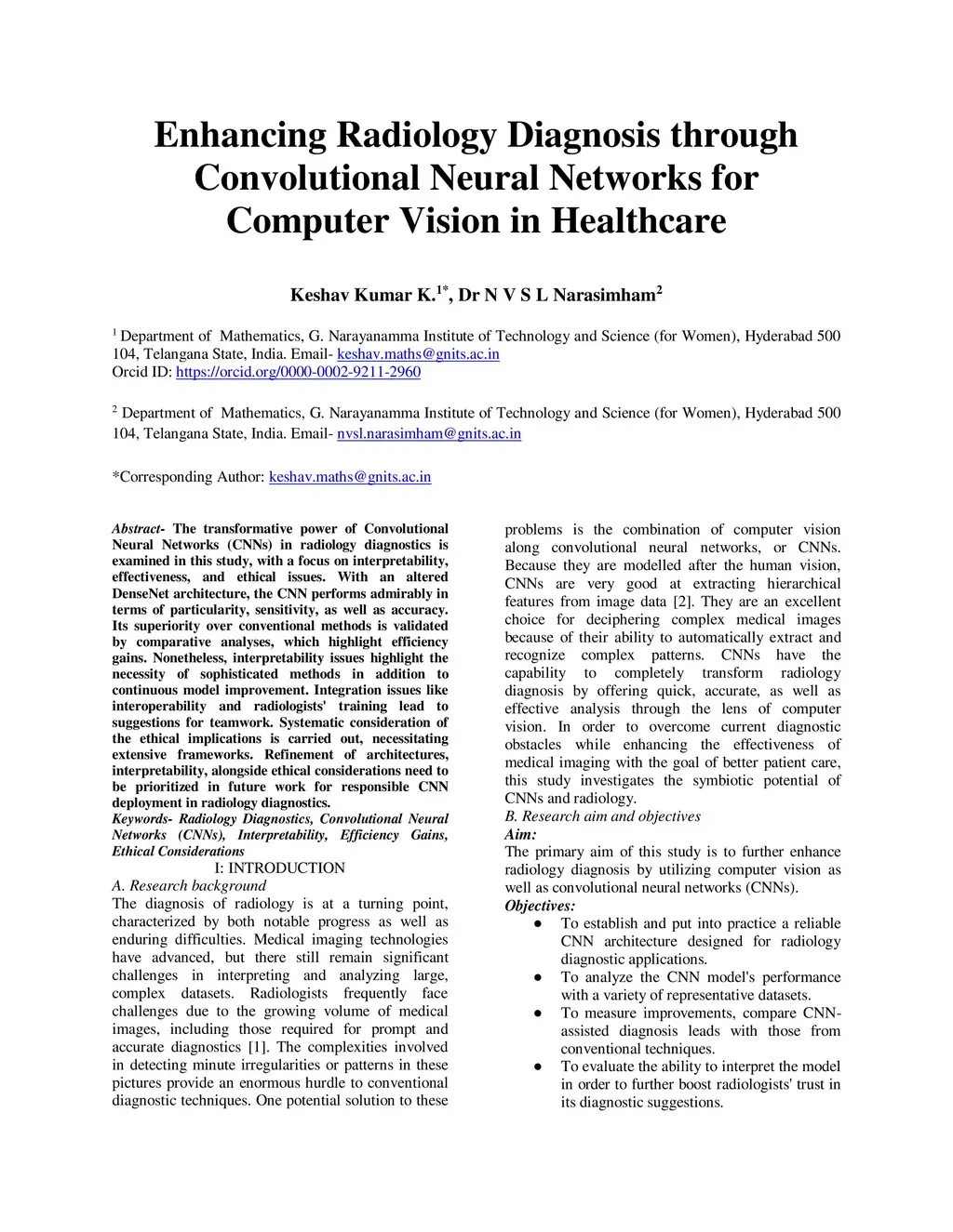 The transformative power of Convolutional Neural Networks (CNNs) in radiology diagnostics is examined in this study, with a focus on interpretability, effectiveness, and ethical issues. With an altered DenseNet architecture, the CNN performs admirably in terms of particularity, sensitivity, as well as accuracy. Its superiority over conventional methods is validated by comparative analyses, which highlight efficiency gains. Nonetheless, interpretability issues highlight the necessity of sophisticated methods in addition to continuous model improvement. Integration issues like interoperability and radiologists' training lead to suggestions for teamwork. Systematic consideration of the ethical implications is carried out, necessitating extensive frameworks. Refinement of architectures, interpretability, alongside ethical considerations need to be prioritized in future work for responsible CNN deployment in radiology diagnostics.