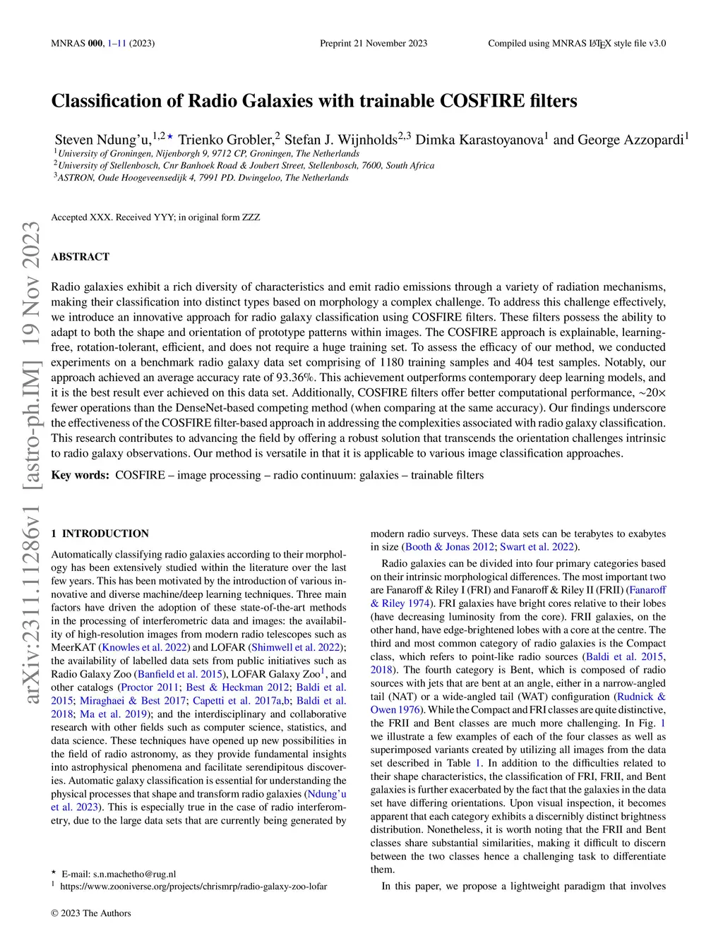Radio galaxies exhibit a rich diversity of characteristics and emit radio emissions through a variety of radiation mechanisms, making their classification into distinct types based on morphology a complex challenge. To address this challenge effectively, we introduce an innovative approach for radio galaxy classification using COSFIRE filters. These filters possess the ability to adapt to both the shape and orientation of prototype patterns within images. The COSFIRE approach is explainable, learning-free, rotation-tolerant, efficient, and does not require a huge training set. To assess the efficacy of our method, we conducted experiments on a benchmark radio galaxy data set comprising of 1180 training samples and 404 test samples. Notably, our approach achieved an average accuracy rate of 93.36\%. This achievement outperforms contemporary deep learning models, and it is the best result ever achieved on this data set. Additionally, COSFIRE filters offer better computational performance, 20 fewer operations than the DenseNet-based competing method (when comparing at the same accuracy). Our findings underscore the effectiveness of the COSFIRE filter-based approach in addressing the complexities associated with radio galaxy classification. This research contributes to advancing the field by offering a robust solution that transcends the orientation challenges intrinsic to radio galaxy observations. Our method is versatile in that it is applicable to various image classification approaches.