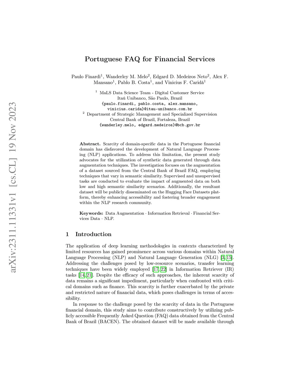 Scarcity of domain-specific data in the Portuguese financial domain has disfavored the development of Natural Language Processing (NLP) applications. To address this limitation, the present study advocates for the utilization of synthetic data generated through data augmentation techniques. The investigation focuses on the augmentation of a dataset sourced from the Central Bank of Brazil FAQ, employing techniques that vary in semantic similarity. Supervised and unsupervised tasks are conducted to evaluate the impact of augmented data on both low and high semantic similarity scenarios. Additionally, the resultant dataset will be publicly disseminated on the Hugging Face Datasets platform, thereby enhancing accessibility and fostering broader engagement within the NLP research community.