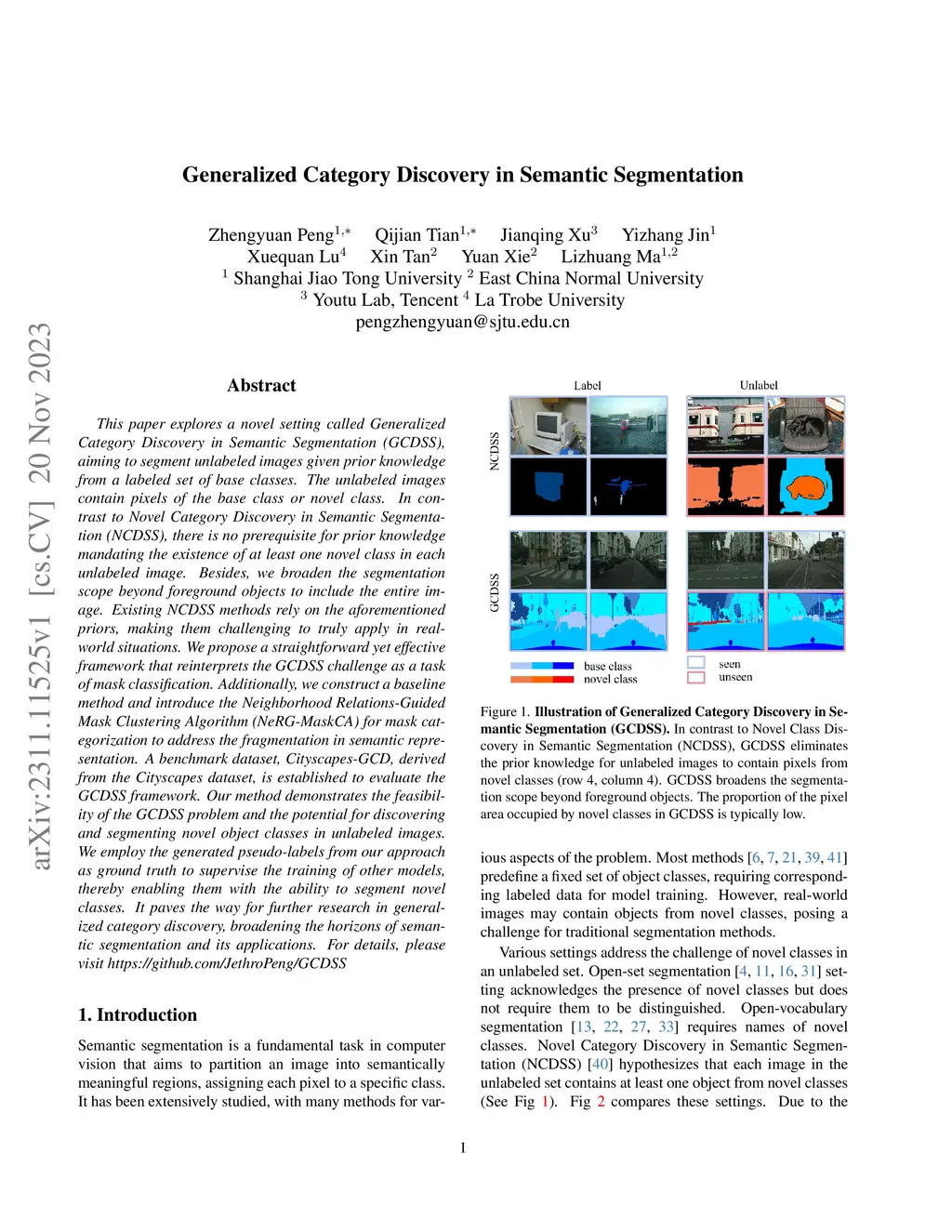 This paper explores a novel setting called Generalized Category Discovery in Semantic Segmentation (GCDSS), aiming to segment unlabeled images given prior knowledge from a labeled set of base classes. The unlabeled images contain pixels of the base class or novel class. In contrast to Novel Category Discovery in Semantic Segmentation (NCDSS), there is no prerequisite for prior knowledge mandating the existence of at least one novel class in each unlabeled image. Besides, we broaden the segmentation scope beyond foreground objects to include the entire image. Existing NCDSS methods rely on the aforementioned priors, making them challenging to truly apply in real-world situations. We propose a straightforward yet effective framework that reinterprets the GCDSS challenge as a task of mask classification. Additionally, we construct a baseline method and introduce the Neighborhood Relations-Guided Mask Clustering Algorithm (NeRG-MaskCA) for mask categorization to address the fragmentation in semantic representation. A benchmark dataset, Cityscapes-GCD, derived from the Cityscapes dataset, is established to evaluate the GCDSS framework. Our method demonstrates the feasibility of the GCDSS problem and the potential for discovering and segmenting novel object classes in unlabeled images. We employ the generated pseudo-labels from our approach as ground truth to supervise the training of other models, thereby enabling them with the ability to segment novel classes. It paves the way for further research in generalized category discovery, broadening the horizons of semantic segmentation and its applications. For details, please visit https://github.com/JethroPeng/GCDSS