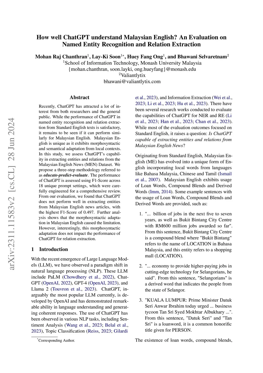 Recently, ChatGPT has attracted a lot of interest from both researchers and the general public. While the performance of ChatGPT in named entity recognition and relation extraction from Standard English texts is satisfactory, it remains to be seen if it can perform similarly for Malaysian English. Malaysian English is unique as it exhibits morphosyntactic and semantical adaptation from local contexts. In this study, we assess ChatGPT's capability in extracting entities and relations from the Malaysian English News (MEN) dataset. We propose a three-step methodology referred to as \textbf{\textit{educate-predict-evaluate}}. The performance of ChatGPT is assessed using F1-Score across 18 unique prompt settings, which were carefully engineered for a comprehensive review. From our evaluation, we found that ChatGPT does not perform well in extracting entities from Malaysian English news articles, with the highest F1-Score of 0.497. Further analysis shows that the morphosyntactic adaptation in Malaysian English caused the limitation. However, interestingly, this morphosyntactic adaptation does not impact the performance of ChatGPT for relation extraction.
