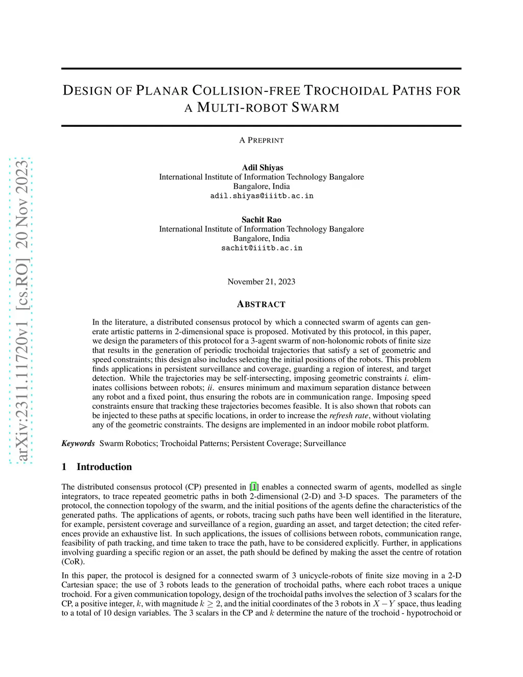In the literature, a distributed consensus protocol by which a connected swarm of agents can generate artistic patterns in 2-dimensional space is proposed. Motivated by this protocol, in this paper, we design the parameters of this protocol for a 3-agent swarm of non-holonomic robots of finite size that results in the generation of periodic trochoidal trajectories that satisfy a set of geometric and speed constraints; this design also includes selecting the initial positions of the robots. This problem finds applications in persistent surveillance and coverage, guarding a region of interest, and target detection. While the trajectories may be self-intersecting, imposing geometric constraints i. eliminates collisions between robots; ii. ensures minimum and maximum separation distance between any robot and a fixed point, thus ensuring the robots are in communication range. Imposing speed constraints ensure that tracking these trajectories becomes feasible. It is also shown that robots can be injected to these paths at specific locations, in order to increase the refresh rate, without violating any of the geometric constraints. The designs are implemented in an indoor mobile robot platform.