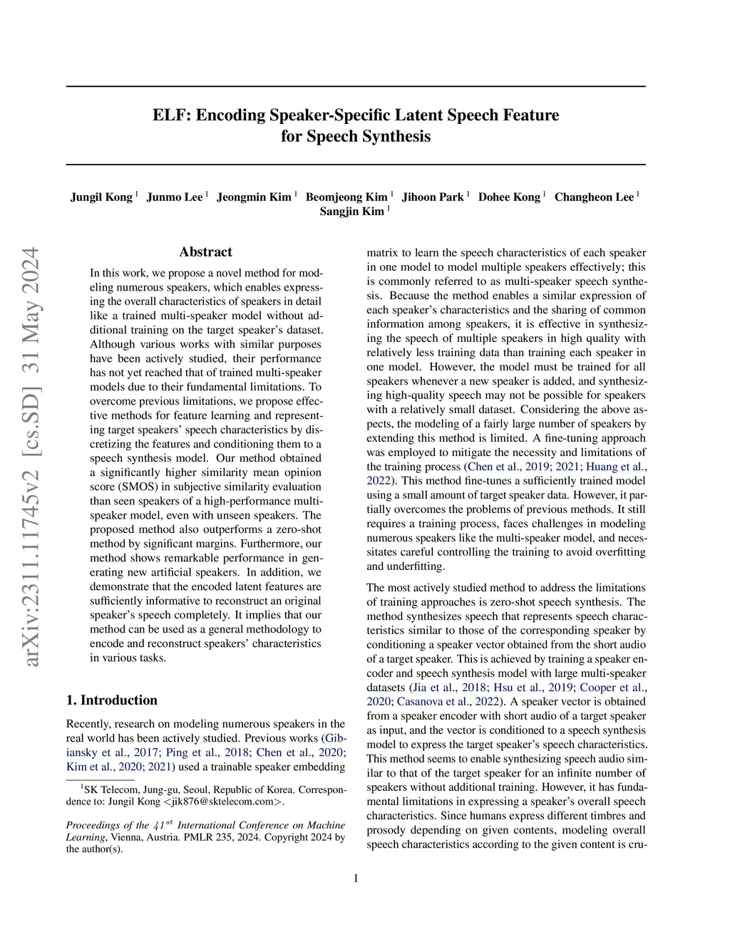 ELF: Encoding Speaker-Specific Latent Speech Feature for Speech