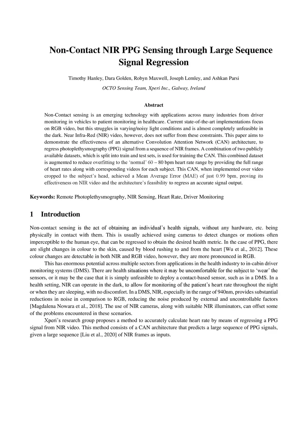 Non-Contact sensing is an emerging technology with applications across many industries from driver monitoring in vehicles to patient monitoring in healthcare. Current state-of-the-art implementations focus on RGB video, but this struggles in varying/noisy light conditions and is almost completely unfeasible in the dark. Near Infra-Red (NIR) video, however, does not suffer from these constraints. This paper aims to demonstrate the effectiveness of an alternative Convolution Attention Network (CAN) architecture, to regress photoplethysmography (PPG) signal from a sequence of NIR frames. A combination of two publicly available datasets, which is split into train and test sets, is used for training the CAN. This combined dataset is augmented to reduce overfitting to the ñormal' 60 - 80 bpm heart rate range by providing the full range of heart rates along with corresponding videos for each subject. This CAN, when implemented over video cropped to the subject's head, achieved a Mean Average Error (MAE) of just 0.99 bpm, proving its effectiveness on NIR video and the architecture's feasibility to regress an accurate signal output.