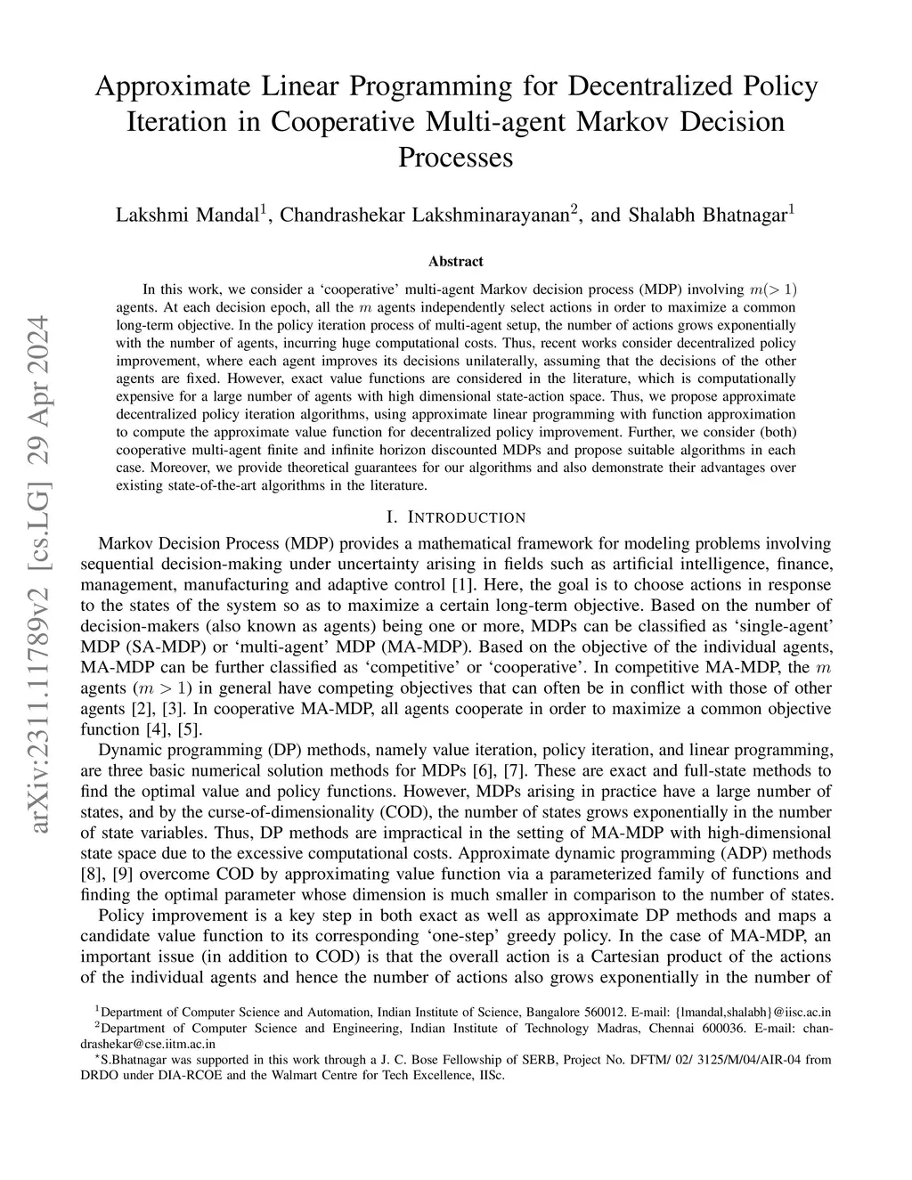 In this work, we consider a cooperative multi-agent Markov decision process (MDP) involving m agents. At each decision epoch, all the m agents independently select actions in order to maximize a common long-term objective. In the policy iteration process of multi-agent setup, the number of actions grows exponentially with the number of agents, incurring huge computational costs. Thus, recent works consider decentralized policy improvement, where each agent improves its decisions unilaterally, assuming that the decisions of the other agents are fixed. However, exact value functions are considered in the literature, which is computationally expensive for a large number of agents with high dimensional state-action space. Thus, we propose approximate decentralized policy iteration algorithms, using approximate linear programming with function approximation to compute the approximate value function for decentralized policy improvement. Further, we consider (both) cooperative multi-agent finite and infinite horizon discounted MDPs and propose suitable algorithms in each case. Moreover, we provide theoretical guarantees for our algorithms and also demonstrate their advantages over existing state-of-the-art algorithms in the literature.