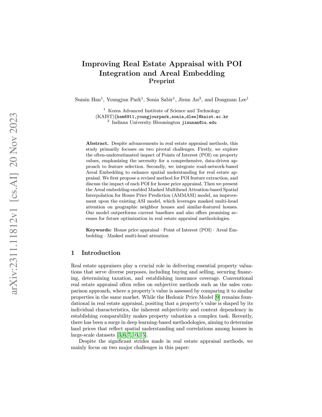 Despite advancements in real estate appraisal methods, this study primarily focuses on two pivotal challenges. Firstly, we explore the often-underestimated impact of Points of Interest (POI) on property values, emphasizing the necessity for a comprehensive, data-driven approach to feature selection. Secondly, we integrate road-network-based Areal Embedding to enhance spatial understanding for real estate appraisal. We first propose a revised method for POI feature extraction, and discuss the impact of each POI for house price appraisal. Then we present the Areal embedding-enabled Masked Multihead Attention-based Spatial Interpolation for House Price Prediction (AMMASI) model, an improvement upon the existing ASI model, which leverages masked multi-head attention on geographic neighbor houses and similar-featured houses. Our model outperforms current baselines and also offers promising avenues for future optimization in real estate appraisal methodologies.