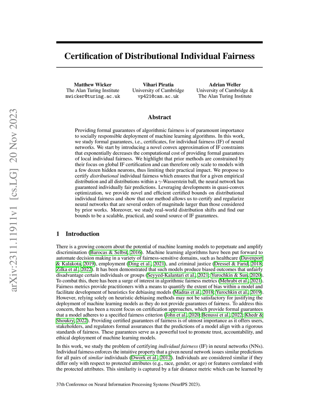 Providing formal guarantees of algorithmic fairness is of paramount importance to socially responsible deployment of machine learning algorithms. In this work, we study formal guarantees, i.e., certificates, for individual fairness (IF) of neural networks. We start by introducing a novel convex approximation of IF constraints that exponentially decreases the computational cost of providing formal guarantees of local individual fairness. We highlight that prior methods are constrained by their focus on global IF certification and can therefore only scale to models with a few dozen hidden neurons, thus limiting their practical impact. We propose to certify distributional individual fairness which ensures that for a given empirical distribution and all distributions within a -Wasserstein ball, the neural network has guaranteed individually fair predictions. Leveraging developments in quasi-convex optimization, we provide novel and efficient certified bounds on distributional individual fairness and show that our method allows us to certify and regularize neural networks that are several orders of magnitude larger than those considered by prior works. Moreover, we study real-world distribution shifts and find our bounds to be a scalable, practical, and sound source of IF guarantees.