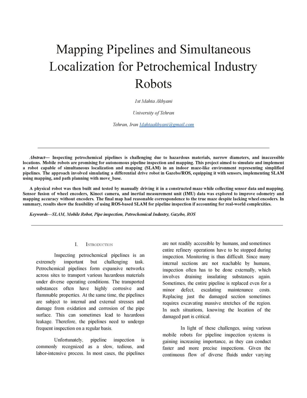 Inspecting petrochemical pipelines is challenging due to hazardous materials, narrow diameters, and inaccessible locations. Mobile robots are promising for autonomous pipeline inspection and mapping. This project aimed to simulate and implement a robot capable of simultaneous localization and mapping (SLAM) in an indoor maze-like environment representing simplified pipelines. The approach involved simulating a differential drive robot in Gazebo/ROS, equipping it with sensors, implementing SLAM using mapping, and path planning with move_base. A physical robot was then built and tested by manually driving it in a constructed maze while collecting sensor data and mapping. Sensor fusion of wheel encoders, Kinect camera, and inertial measurement unit (IMU) data was explored to improve odometry and mapping accuracy without encoders. The final map had reasonable correspondence to the true maze despite lacking wheel encoders. In summary, results show the feasibility of using ROS-based SLAM for pipeline inspection if accounting for real-world complexities.