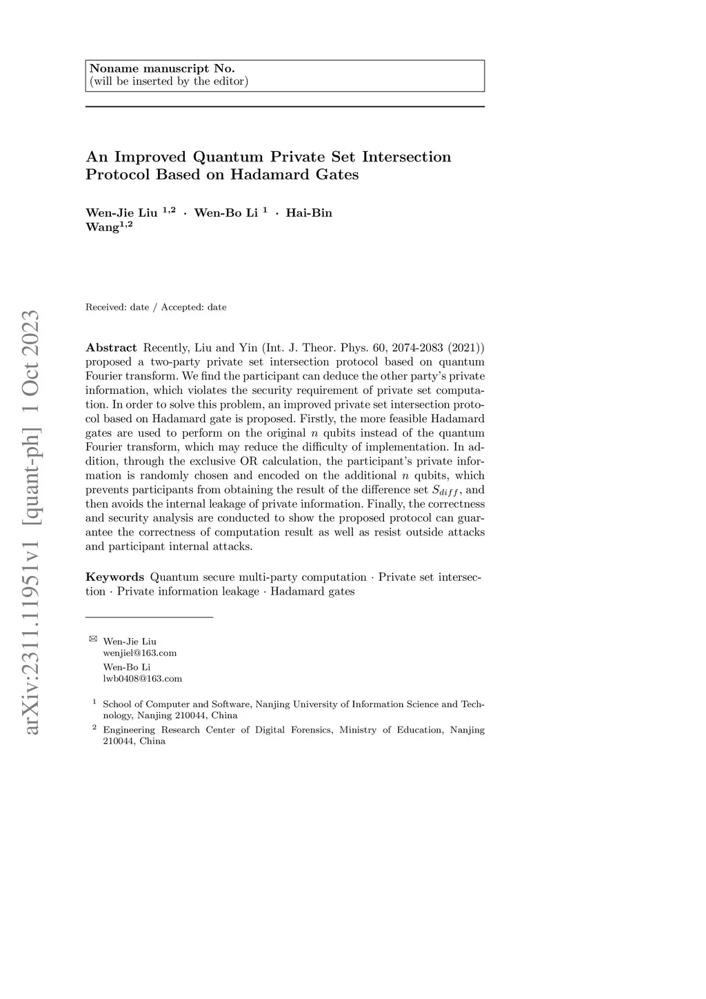 Recently, Liu and Yin (Int. J. Theor. Phys. 60, 2074-2083 (2021)) proposed a two-party private set intersection protocol based on quantum Fourier transform. We find the participant can deduce the other party's private information, which violates the security requirement of private set computation. In order to solve this problem, an improved private set intersection protocol based on Hadamard gate is proposed. Firstly, the more feasible Hadamard gates are used to perform on the original n qubits instead of the quantum Fourier transform, which may reduce the difficulty of implementation. In addition, through the exclusive OR calculation, the participant's private information is randomly chosen and encoded on the additional n qubits, which prevents participants from obtaining the result of the difference set S-diff , and then avoids the internal leakage of private information. Finally, the correctness and security analysis are conducted to show the proposed protocol can guarantee the correctness of computation result as well as resist outside attacks and participant internal attacks.