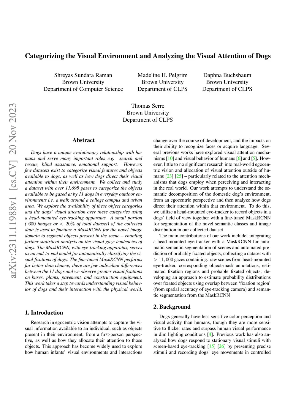 Dogs have a unique evolutionary relationship with humans and serve many important roles e.g. search and rescue, blind assistance, emotional support. However, few datasets exist to categorize visual features and objects available to dogs, as well as how dogs direct their visual attention within their environment. We collect and study a dataset with over 11,698 gazes to categorize the objects available to be gazed at by 11 dogs in everyday outdoor environments i.e. a walk around a college campus and urban area. We explore the availability of these object categories and the visual attention of dogs over these categories using a head mounted eye tracking apparatus. A small portion (approx. 600 images or < 20% of total dataset) of the collected data is used to fine tune a MaskRCNN for the novel image domain to segment objects present in the scene, enabling further statistical analysis on the visual gaze tendencies of dogs. The MaskRCNN, with eye tracking apparatus, serves as an end to end model for automatically classifying the visual fixations of dogs. The fine tuned MaskRCNN performs far better than chance. There are few individual differences between the 11 dogs and we observe greater visual fixations on buses, plants, pavement, and construction equipment. This work takes a step towards understanding visual behavior of dogs and their interaction with the physical world.