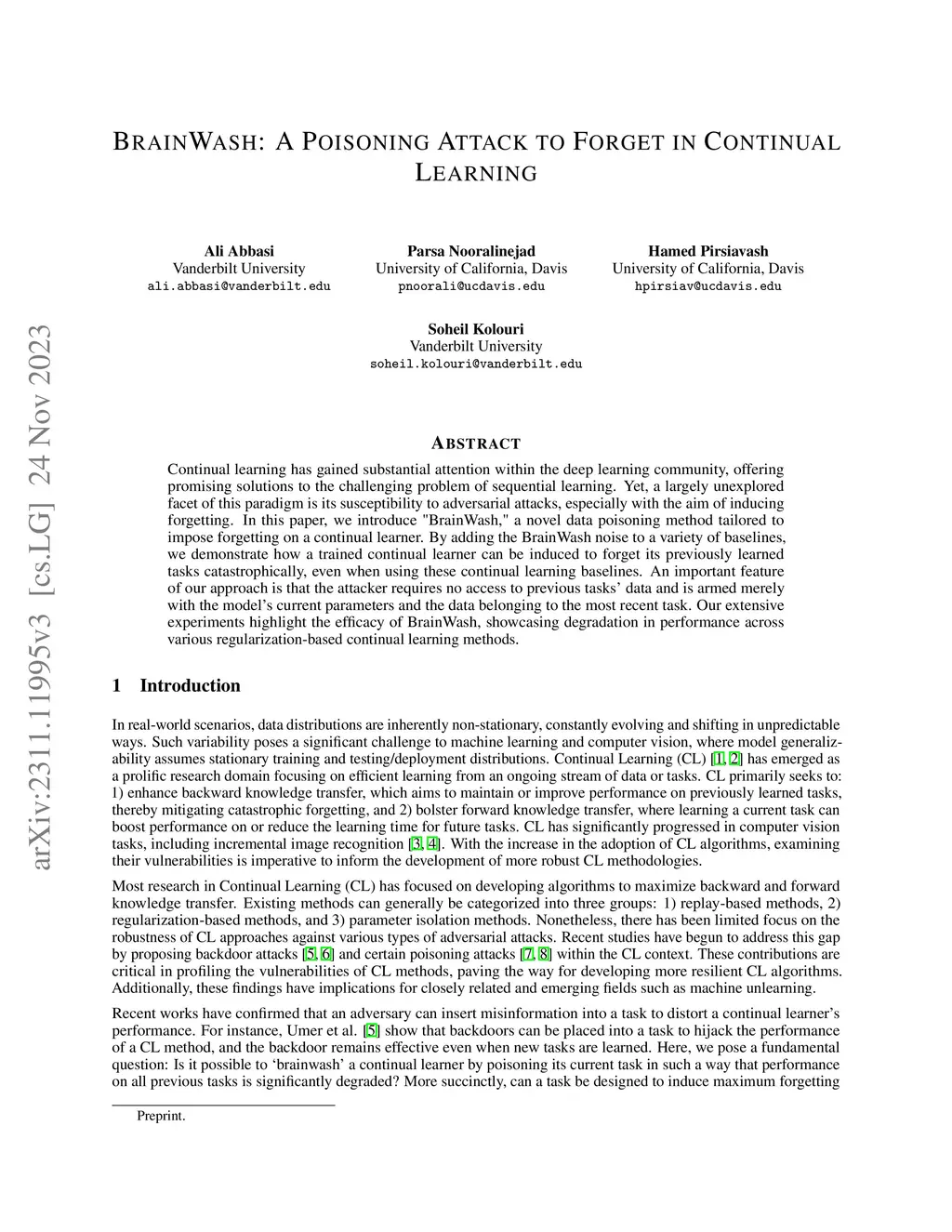 Continual learning has gained substantial attention within the deep learning community, offering promising solutions to the challenging problem of sequential learning. Yet, a largely unexplored facet of this paradigm is its susceptibility to adversarial attacks, especially with the aim of inducing forgetting. In this paper, we introduce "BrainWash," a novel data poisoning method tailored to impose forgetting on a continual learner. By adding the BrainWash noise to a variety of baselines, we demonstrate how a trained continual learner can be induced to forget its previously learned tasks catastrophically, even when using these continual learning baselines. An important feature of our approach is that the attacker requires no access to previous tasks' data and is armed merely with the model's current parameters and the data belonging to the most recent task. Our extensive experiments highlight the efficacy of BrainWash, showcasing degradation in performance across various regularization-based continual learning methods.