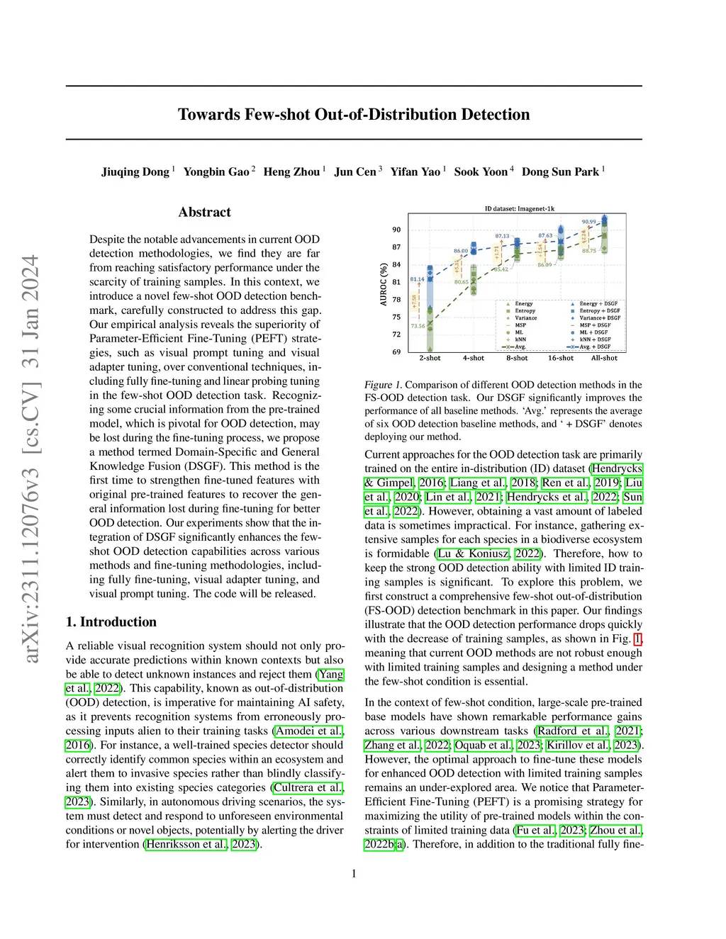 Out-of-distribution (OOD) detection is critical for ensuring the reliability of open-world intelligent systems. Despite the notable advancements in existing OOD detection methodologies, our study identifies a significant performance drop under the scarcity of training samples. In this context, we introduce a novel few-shot OOD detection benchmark, carefully constructed to address this gap. Our empirical analysis reveals the superiority of ParameterEfficient Fine-Tuning (PEFT) strategies, such as visual prompt tuning and visual adapter tuning, over conventional techniques, including fully fine-tuning and linear probing tuning in the few-shot OOD detection task. Recognizing some crucial information from the pre-trained model, which is pivotal for OOD detection, may be lost during the fine-tuning process, we propose a method termed DomainSpecific and General Knowledge Fusion (DSGF). This approach is designed to be compatible with diverse fine-tuning frameworks. Our experiments show that the integration of DSGF significantly enhances the few-shot OOD detection capabilities across various methods and fine-tuning methodologies, including fully fine-tuning, visual adapter tuning, and visual prompt tuning. The code will be released.
