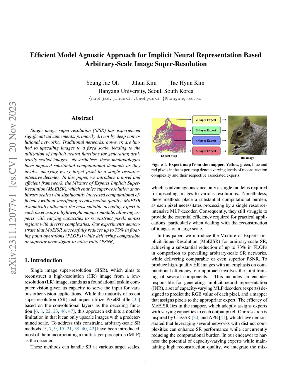Arbitrary-scale image super-resolution employing implicit neural functions has gained significant attention lately due to its capability to upscale images across diverse scales utilizing only a single model. Nevertheless, these methodologies have imposed substantial computational demands as they involve querying every target pixel to a single resource-intensive decoder. In this paper, we introduce a novel and efficient framework, the Mixture-of-Experts Implicit Super-Resolution (MoEISR), which enables super-resolution at arbitrary scales with significantly increased computational efficiency without sacrificing reconstruction quality. MoEISR dynamically allocates the most suitable decoding expert to each pixel using a lightweight mapper module, allowing experts with varying capacities to reconstruct pixels across regions with diverse complexities. Our experiments demonstrate that MoEISR successfully reduces significant amount of floating point operations (FLOPs) while delivering comparable or superior peak signal-to-noise ratio (PSNR).