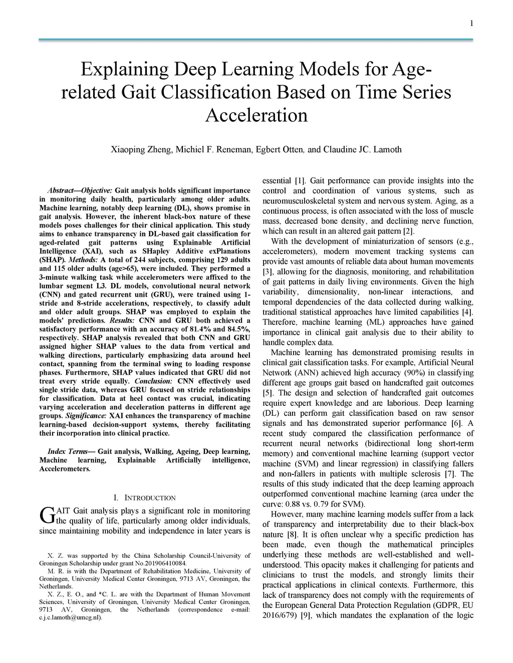 Gait analysis holds significant importance in monitoring daily health, particularly among older adults. Advancements in sensor technology enable the capture of movement in real-life environments and generate big data. Machine learning, notably deep learning (DL), shows promise to use these big data in gait analysis. However, the inherent black-box nature of these models poses challenges for their clinical application. This study aims to enhance transparency in DL-based gait classification for aged-related gait patterns using Explainable Artificial Intelligence, such as SHAP. A total of 244 subjects, comprising 129 adults and 115 older adults (age>65), were included. They performed a 3-minute walking task while accelerometers were affixed to the lumbar segment L3. DL models, convolutional neural network (CNN) and gated recurrent unit (GRU), were trained using 1-stride and 8-stride accelerations, respectively, to classify adult and older adult groups. SHAP was employed to explain the models' predictions. CNN achieved a satisfactory performance with an accuracy of 81.4% and an AUC of 0.89, and GRU demonstrated promising results with an accuracy of 84.5% and an AUC of 0.94. SHAP analysis revealed that both CNN and GRU assigned higher SHAP values to the data from vertical and walking directions, particularly emphasizing data around heel contact, spanning from the terminal swing to loading response phases. Furthermore, SHAP values indicated that GRU did not treat every stride equally. CNN accurately distinguished between adults and older adults based on the characteristics of a single stride's data. GRU achieved accurate classification by considering the relationships and subtle differences between strides. In both models, data around heel contact emerged as most critical, suggesting differences in acceleration and deceleration patterns during walking between different age groups.