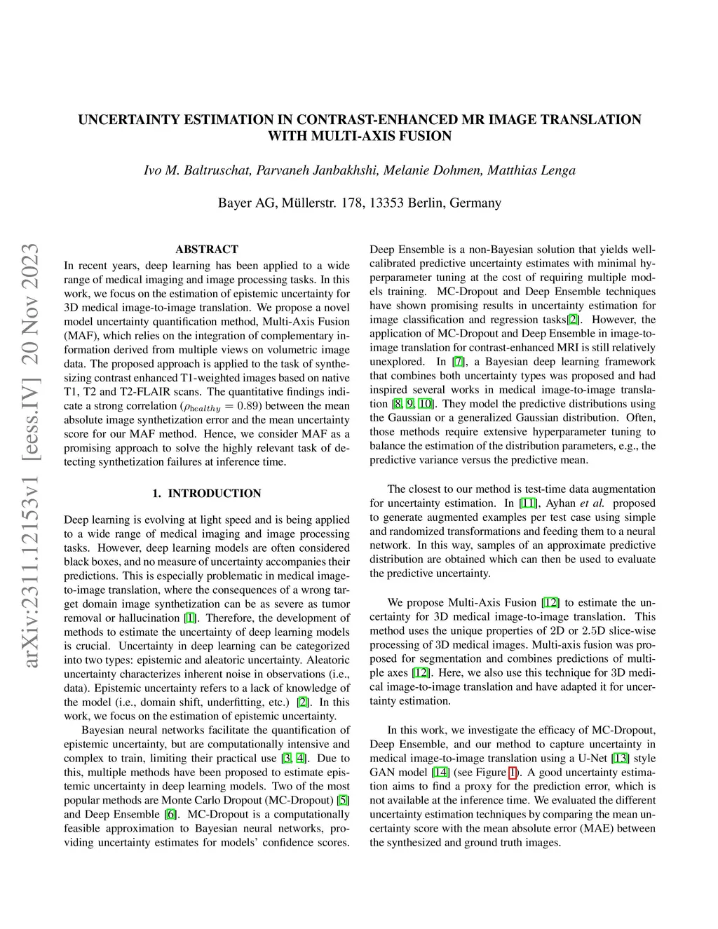 In recent years, deep learning has been applied to a wide range of medical imaging and image processing tasks. In this work, we focus on the estimation of epistemic uncertainty for 3D medical image-to-image translation. We propose a novel model uncertainty quantification method, Multi-Axis Fusion (MAF), which relies on the integration of complementary information derived from multiple views on volumetric image data. The proposed approach is applied to the task of synthesizing contrast enhanced T1-weighted images based on native T1, T2 and T2-FLAIR scans. The quantitative findings indicate a strong correlation () between the mean absolute image synthetization error and the mean uncertainty score for our MAF method. Hence, we consider MAF as a promising approach to solve the highly relevant task of detecting synthetization failures at inference time.
