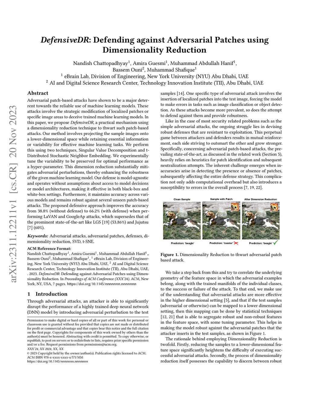DefensiveDR: Defending against Adversarial Patches using Dimensionality