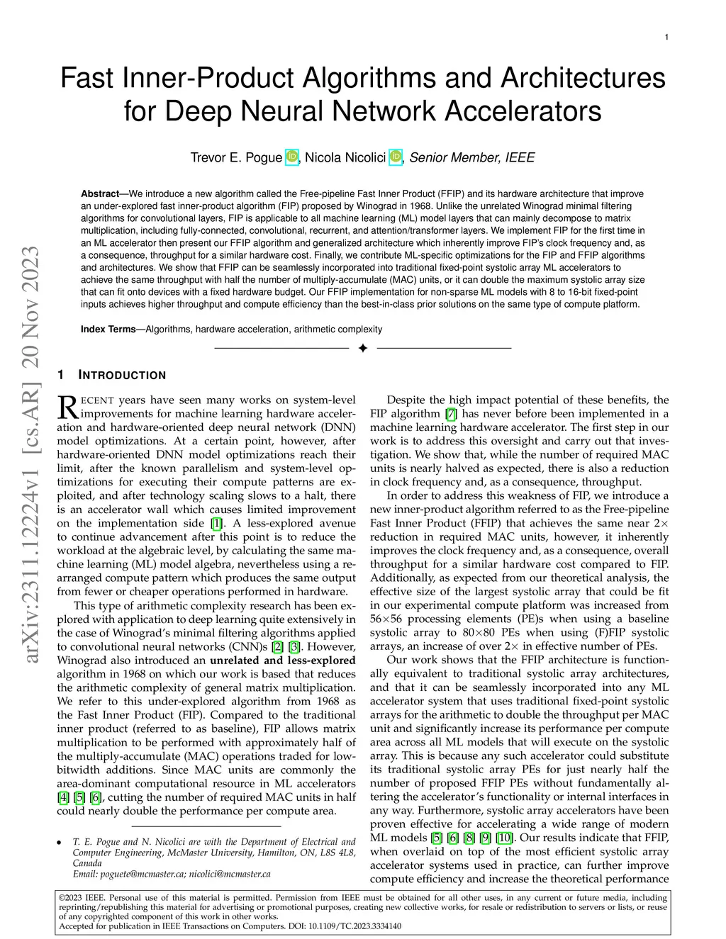 We introduce a new algorithm called the Free-pipeline Fast Inner Product (FFIP) and its hardware architecture that improve an under-explored fast inner-product algorithm (FIP) proposed by Winograd in 1968. Unlike the unrelated Winograd minimal filtering algorithms for convolutional layers, FIP is applicable to all machine learning (ML) model layers that can mainly decompose to matrix multiplication, including fully-connected, convolutional, recurrent, and attention/transformer layers. We implement FIP for the first time in an ML accelerator then present our FFIP algorithm and generalized architecture which inherently improve FIP's clock frequency and, as a consequence, throughput for a similar hardware cost. Finally, we contribute ML-specific optimizations for the FIP and FFIP algorithms and architectures. We show that FFIP can be seamlessly incorporated into traditional fixed-point systolic array ML accelerators to achieve the same throughput with half the number of multiply-accumulate (MAC) units, or it can double the maximum systolic array size that can fit onto devices with a fixed hardware budget. Our FFIP implementation for non-sparse ML models with 8 to 16-bit fixed-point inputs achieves higher throughput and compute efficiency than the best-in-class prior solutions on the same type of compute platform.