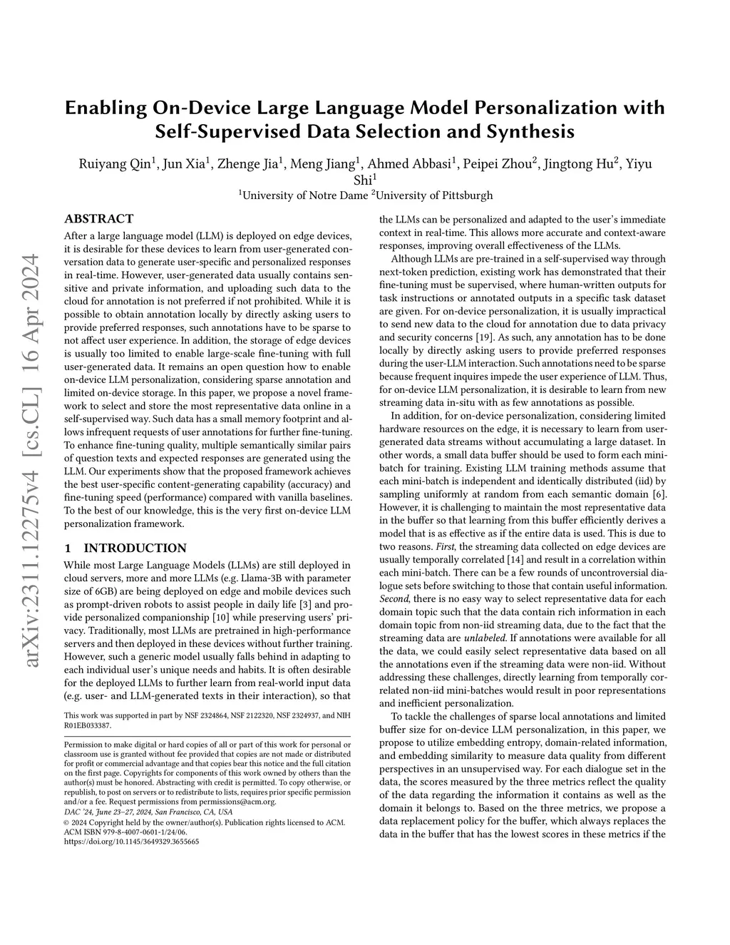 After a large language model (LLM) is deployed on edge devices, it is desirable for these devices to learn from user-generated conversation data to generate user-specific and personalized responses in real-time. However, user-generated data usually contains sensitive and private information, and uploading such data to the cloud for annotation is not preferred if not prohibited. While it is possible to obtain annotation locally by directly asking users to provide preferred responses, such annotations have to be sparse to not affect user experience. In addition, the storage of edge devices is usually too limited to enable large-scale fine-tuning with full user-generated data. It remains an open question how to enable on-device LLM personalization, considering sparse annotation and limited on-device storage. In this paper, we propose a novel framework to select and store the most representative data online in a self-supervised way. Such data has a small memory footprint and allows infrequent requests of user annotations for further fine-tuning. To enhance fine-tuning quality, multiple semantically similar pairs of question texts and expected responses are generated using the LLM. Our experiments show that the proposed framework achieves the best user-specific content-generating capability (accuracy) and fine-tuning speed (performance) compared with vanilla baselines. To the best of our knowledge, this is the very first on-device LLM personalization framework.