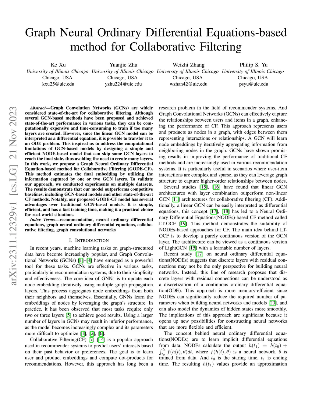 Graph Convolution Networks (GCNs) are widely considered state-of-the-art for collaborative filtering. Although several GCN-based methods have been proposed and achieved state-of-the-art performance in various tasks, they can be computationally expensive and time-consuming to train if too many layers are created. However, since the linear GCN model can be interpreted as a differential equation, it is possible to transfer it to an ODE problem. This inspired us to address the computational limitations of GCN-based models by designing a simple and efficient NODE-based model that can skip some GCN layers to reach the final state, thus avoiding the need to create many layers. In this work, we propose a Graph Neural Ordinary Differential Equation-based method for Collaborative Filtering (GODE-CF). This method estimates the final embedding by utilizing the information captured by one or two GCN layers. To validate our approach, we conducted experiments on multiple datasets. The results demonstrate that our model outperforms competitive baselines, including GCN-based models and other state-of-the-art CF methods. Notably, our proposed GODE-CF model has several advantages over traditional GCN-based models. It is simple, efficient, and has a fast training time, making it a practical choice for real-world situations.