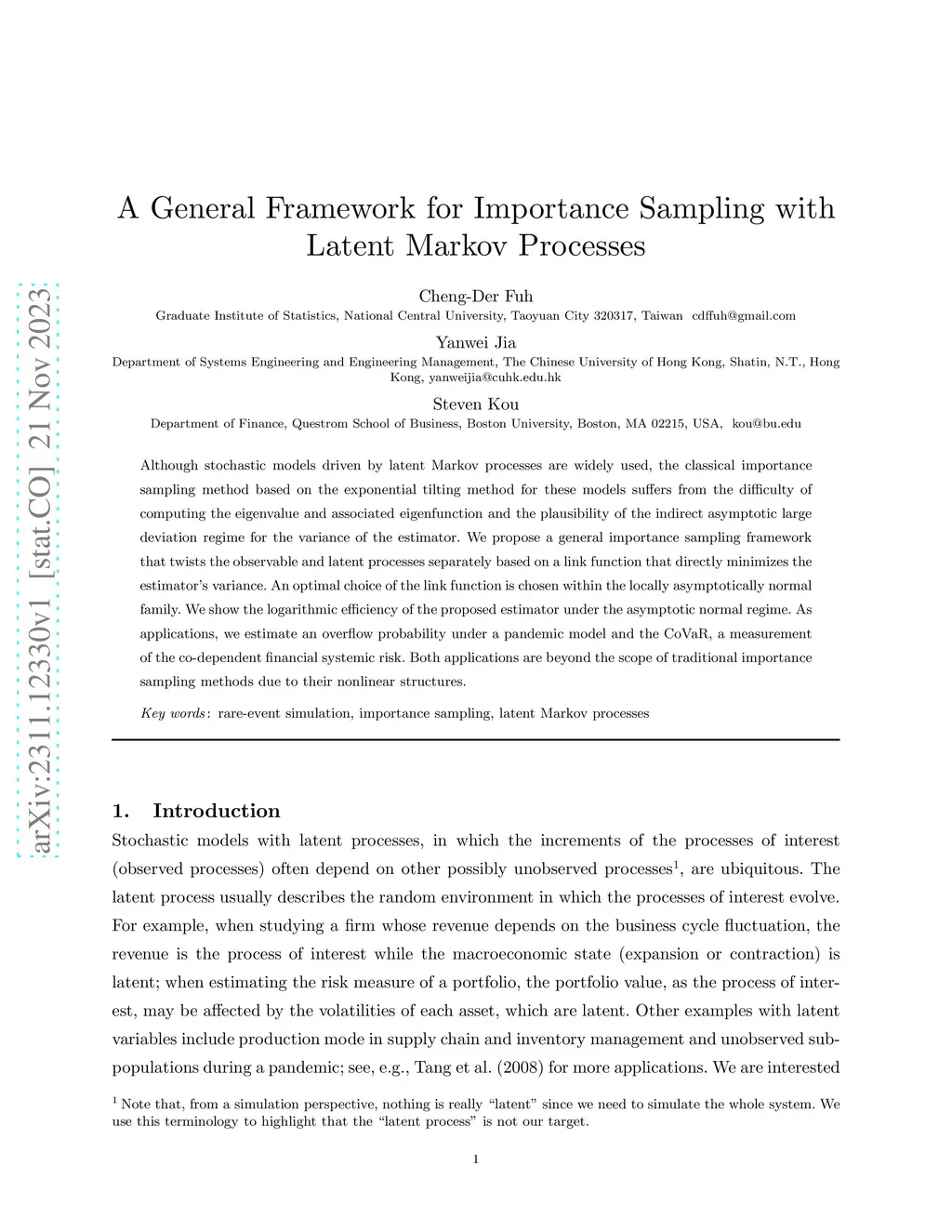 Although stochastic models driven by latent Markov processes are widely used, the classical importance sampling method based on the exponential tilting method for these models suffers from the difficulty of computing the eigenvalue and associated eigenfunction and the plausibility of the indirect asymptotic large deviation regime for the variance of the estimator. We propose a general importance sampling framework that twists the observable and latent processes separately based on a link function that directly minimizes the estimator's variance. An optimal choice of the link function is chosen within the locally asymptotically normal family. We show the logarithmic efficiency of the proposed estimator under the asymptotic normal regime. As applications, we estimate an overflow probability under a pandemic model and the CoVaR, a measurement of the co-dependent financial systemic risk. Both applications are beyond the scope of traditional importance sampling methods due to their nonlinear structures.