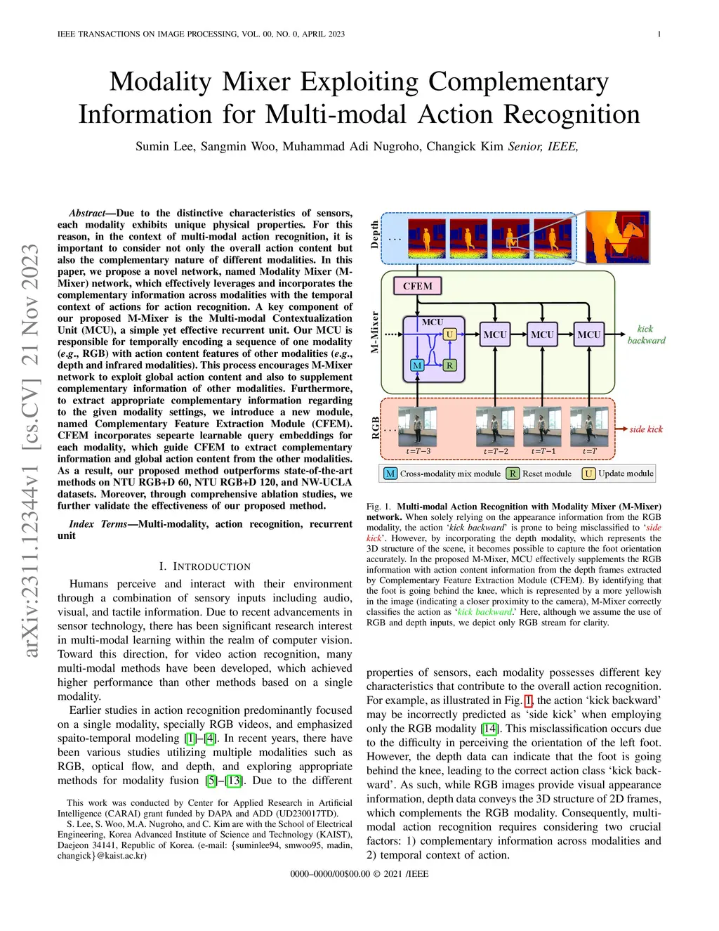 Due to the distinctive characteristics of sensors, each modality exhibits unique physical properties. For this reason, in the context of multi-modal action recognition, it is important to consider not only the overall action content but also the complementary nature of different modalities. In this paper, we propose a novel network, named Modality Mixer (M-Mixer) network, which effectively leverages and incorporates the complementary information across modalities with the temporal context of actions for action recognition. A key component of our proposed M-Mixer is the Multi-modal Contextualization Unit (MCU), a simple yet effective recurrent unit. Our MCU is responsible for temporally encoding a sequence of one modality (e.g., RGB) with action content features of other modalities (e.g., depth and infrared modalities). This process encourages M-Mixer network to exploit global action content and also to supplement complementary information of other modalities. Furthermore, to extract appropriate complementary information regarding to the given modality settings, we introduce a new module, named Complementary Feature Extraction Module (CFEM). CFEM incorporates sepearte learnable query embeddings for each modality, which guide CFEM to extract complementary information and global action content from the other modalities. As a result, our proposed method outperforms state-of-the-art methods on NTU RGB+D 60, NTU RGB+D 120, and NW-UCLA datasets. Moreover, through comprehensive ablation studies, we further validate the effectiveness of our proposed method.