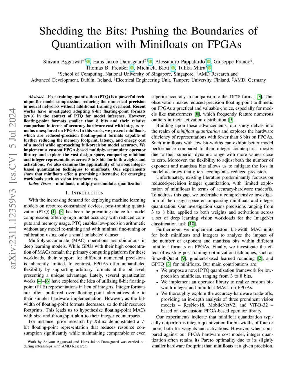 Post-training quantization (PTQ) is a powerful technique for model compression, reducing the numerical precision in neural networks without additional training overhead. Recent works have investigated adopting 8-bit floating-point formats(FP8) in the context of PTQ for model inference. However, floating-point formats smaller than 8 bits and their relative comparison in terms of accuracy-hardware cost with integers remains unexplored on FPGAs. In this work, we present minifloats, which are reduced-precision floating-point formats capable of further reducing the memory footprint, latency, and energy cost of a model while approaching full-precision model accuracy. We implement a custom FPGA-based multiply-accumulate operator library and explore the vast design space, comparing minifloat and integer representations across 3 to 8 bits for both weights and activations. We also examine the applicability of various integerbased quantization techniques to minifloats. Our experiments show that minifloats offer a promising alternative for emerging workloads such as vision transformers.