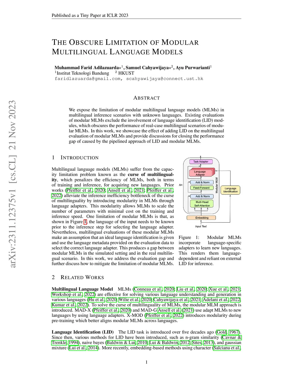 We expose the limitation of modular multilingual language models (MLMs) in multilingual inference scenarios with unknown languages. Existing evaluations of modular MLMs exclude the involvement of language identification (LID) modules, which obscures the performance of real-case multilingual scenarios of modular MLMs. In this work, we showcase the effect of adding LID on the multilingual evaluation of modular MLMs and provide discussions for closing the performance gap of caused by the pipelined approach of LID and modular MLMs.
