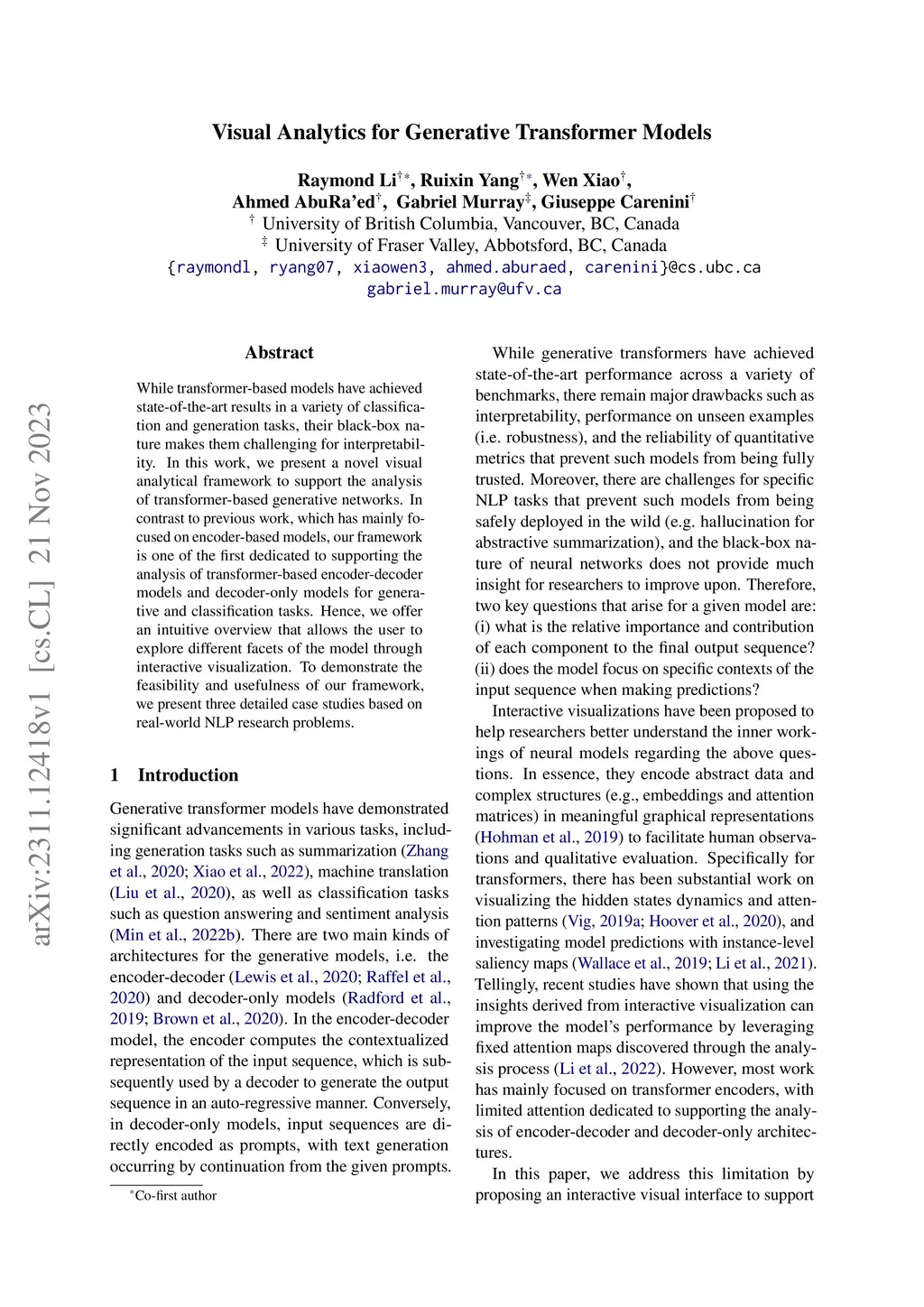 While transformer-based models have achieved state-of-the-art results in a variety of classification and generation tasks, their black-box nature makes them challenging for interpretability. In this work, we present a novel visual analytical framework to support the analysis of transformer-based generative networks. In contrast to previous work, which has mainly focused on encoder-based models, our framework is one of the first dedicated to supporting the analysis of transformer-based encoder-decoder models and decoder-only models for generative and classification tasks. Hence, we offer an intuitive overview that allows the user to explore different facets of the model through interactive visualization. To demonstrate the feasibility and usefulness of our framework, we present three detailed case studies based on real-world NLP research problems.
