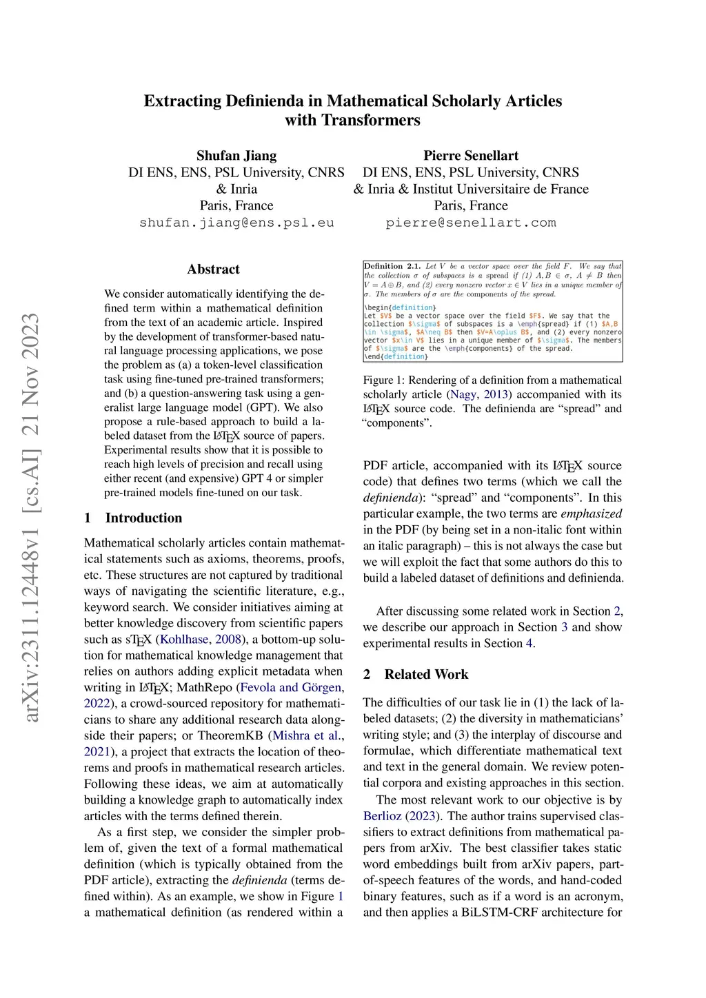 We consider automatically identifying the defined term within a mathematical definition from the text of an academic article. Inspired by the development of transformer-based natural language processing applications, we pose the problem as (a) a token-level classification task using fine-tuned pre-trained transformers; and (b) a question-answering task using a generalist large language model (GPT). We also propose a rule-based approach to build a labeled dataset from the LATEX source of papers. Experimental results show that it is possible to reach high levels of precision and recall using either recent (and expensive) GPT 4 or simpler pre-trained models fine-tuned on our task.