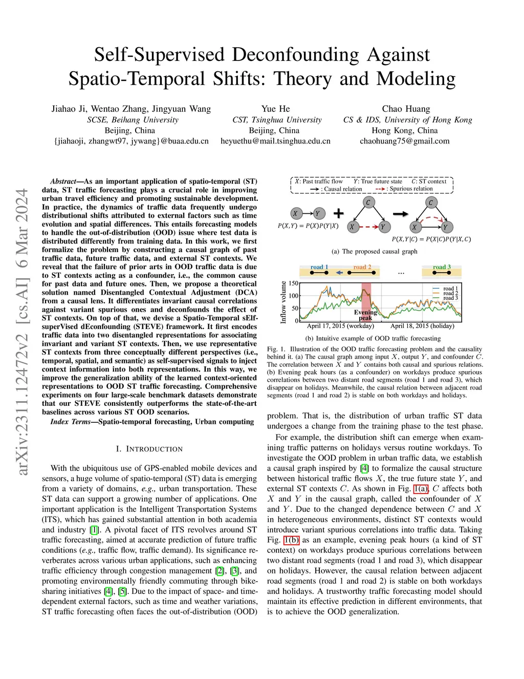 Traffic prediction is essential for intelligent transportation systems and urban computing. It aims to establish a relationship between historical traffic data X and future traffic states Y by employing various statistical or deep learning methods. However, the relations of X -> Y are often influenced by external confounders that simultaneously affect both X and Y , such as weather, accidents, and holidays. Existing deep-learning traffic prediction models adopt the classic front-door and back-door adjustments to address the confounder issue. However, these methods have limitations in addressing continuous or undefined confounders, as they depend on predefined discrete values that are often impractical in complex, real-world scenarios. To overcome this challenge, we propose the Spatial-Temporal sElf-superVised confoundEr learning (STEVE) model. This model introduces a basis vector approach, creating a base confounder bank to represent any confounder as a linear combination of a group of basis vectors. It also incorporates self-supervised auxiliary tasks to enhance the expressive power of the base confounder bank. Afterward, a confounder-irrelevant relation decoupling module is adopted to separate the confounder effects from direct X -> Y relations. Extensive experiments across four large-scale datasets validate our model's superior performance in handling spatial and temporal distribution shifts and underscore its adaptability to unseen confounders. Our model implementation is available atthis https URL.