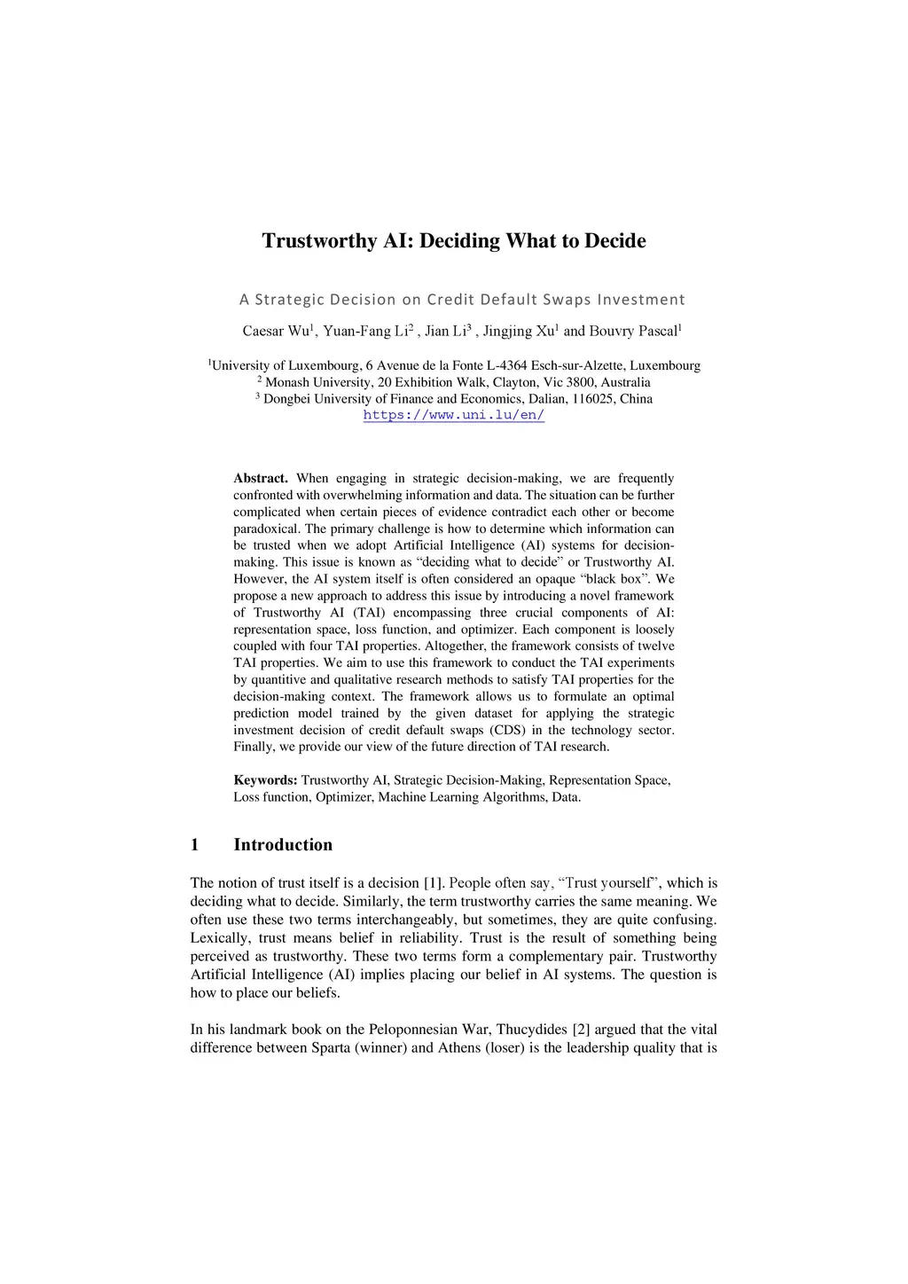 When engaging in strategic decision-making, we are frequently confronted with overwhelming information and data. The situation can be further complicated when certain pieces of evidence contradict each other or become paradoxical. The primary challenge is how to determine which information can be trusted when we adopt Artificial Intelligence (AI) systems for decision-making. This issue is known as deciding what to decide or Trustworthy AI. However, the AI system itself is often considered an opaque black box. We propose a new approach to address this issue by introducing a novel framework of Trustworthy AI (TAI) encompassing three crucial components of AI: representation space, loss function, and optimizer. Each component is loosely coupled with four TAI properties. Altogether, the framework consists of twelve TAI properties. We aim to use this framework to conduct the TAI experiments by quantitive and qualitative research methods to satisfy TAI properties for the decision-making context. The framework allows us to formulate an optimal prediction model trained by the given dataset for applying the strategic investment decision of credit default swaps (CDS) in the technology sector. Finally, we provide our view of the future direction of TAI research