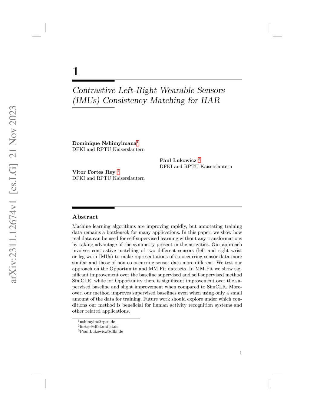 Machine learning algorithms are improving rapidly, but annotating training data remains a bottleneck for many applications. In this paper, we show how real data can be used for self-supervised learning without any transformations by taking advantage of the symmetry present in the activities. Our approach involves contrastive matching of two different sensors (left and right wrist or leg-worn IMUs) to make representations of co-occurring sensor data more similar and those of non-co-occurring sensor data more different. We test our approach on the Opportunity and MM-Fit datasets. In MM-Fit we show significant improvement over the baseline supervised and self-supervised method SimCLR, while for Opportunity there is significant improvement over the supervised baseline and slight improvement when compared to SimCLR. Moreover, our method improves supervised baselines even when using only a small amount of the data for training. Future work should explore under which conditions our method is beneficial for human activity recognition systems and other related applications.