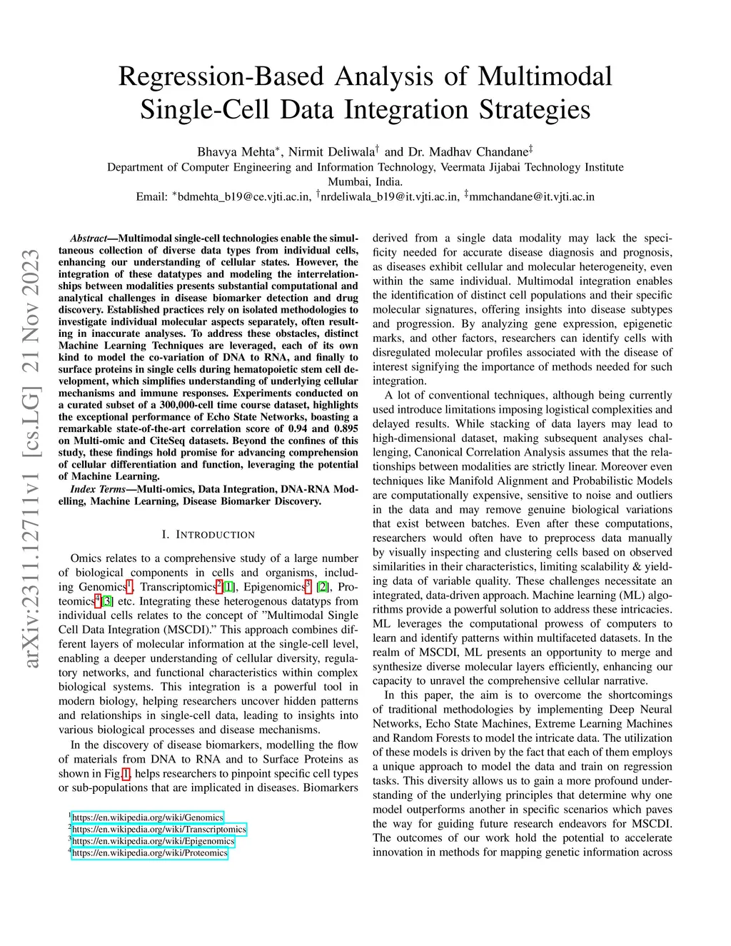 Multimodal single-cell technologies enable the simultaneous collection of diverse data types from individual cells, enhancing our understanding of cellular states. However, the integration of these datatypes and modeling the interrelationships between modalities presents substantial computational and analytical challenges in disease biomarker detection and drug discovery. Established practices rely on isolated methodologies to investigate individual molecular aspects separately, often resulting in inaccurate analyses. To address these obstacles, distinct Machine Learning Techniques are leveraged, each of its own kind to model the co-variation of DNA to RNA, and finally to surface proteins in single cells during hematopoietic stem cell development, which simplifies understanding of underlying cellular mechanisms and immune responses. Experiments conducted on a curated subset of a 300,000-cell time course dataset, highlights the exceptional performance of Echo State Networks, boasting a remarkable state-of-the-art correlation score of 0.94 and 0.895 on Multi-omic and CiteSeq datasets. Beyond the confines of this study, these findings hold promise for advancing comprehension of cellular differentiation and function, leveraging the potential of Machine Learning.